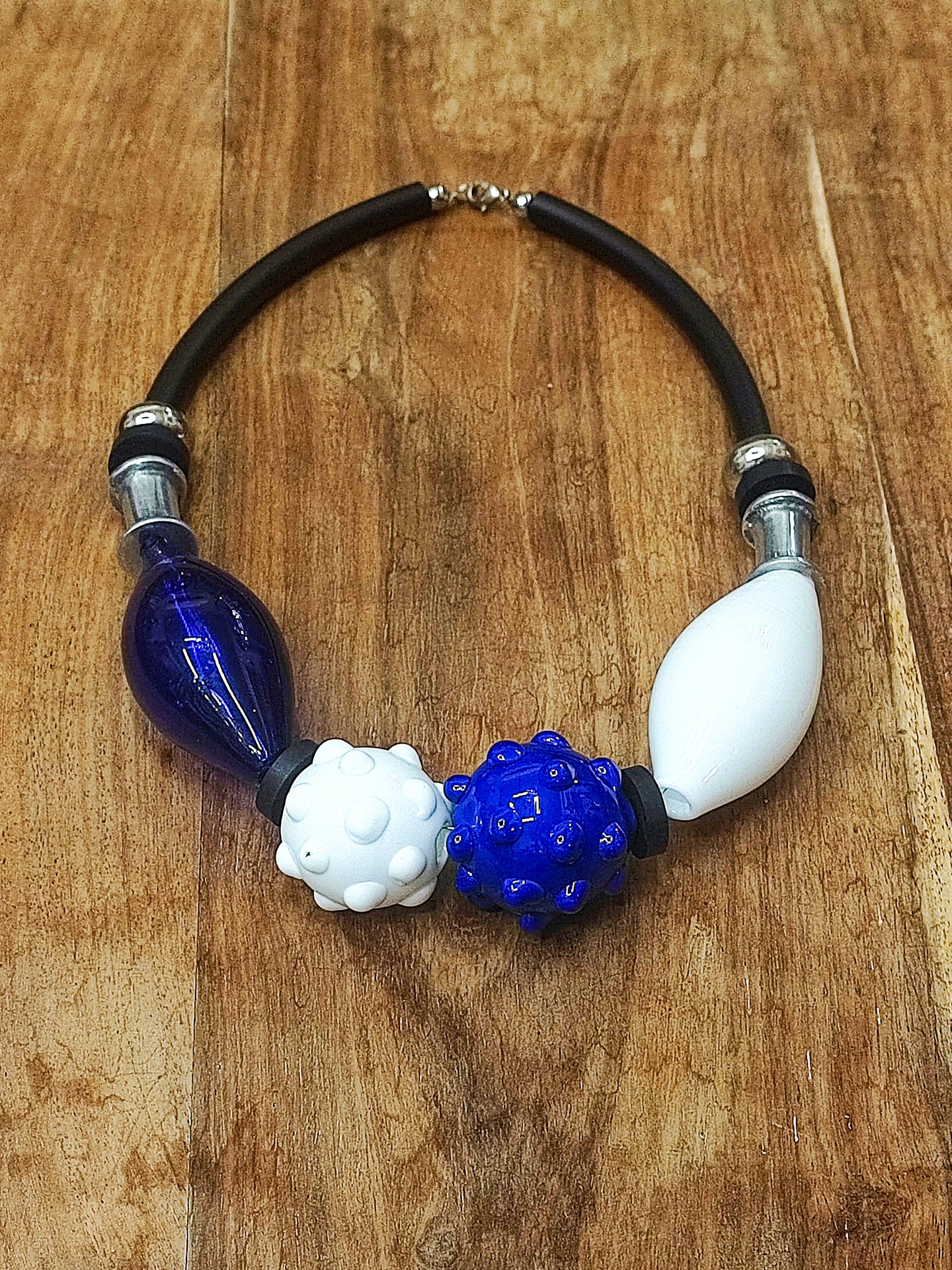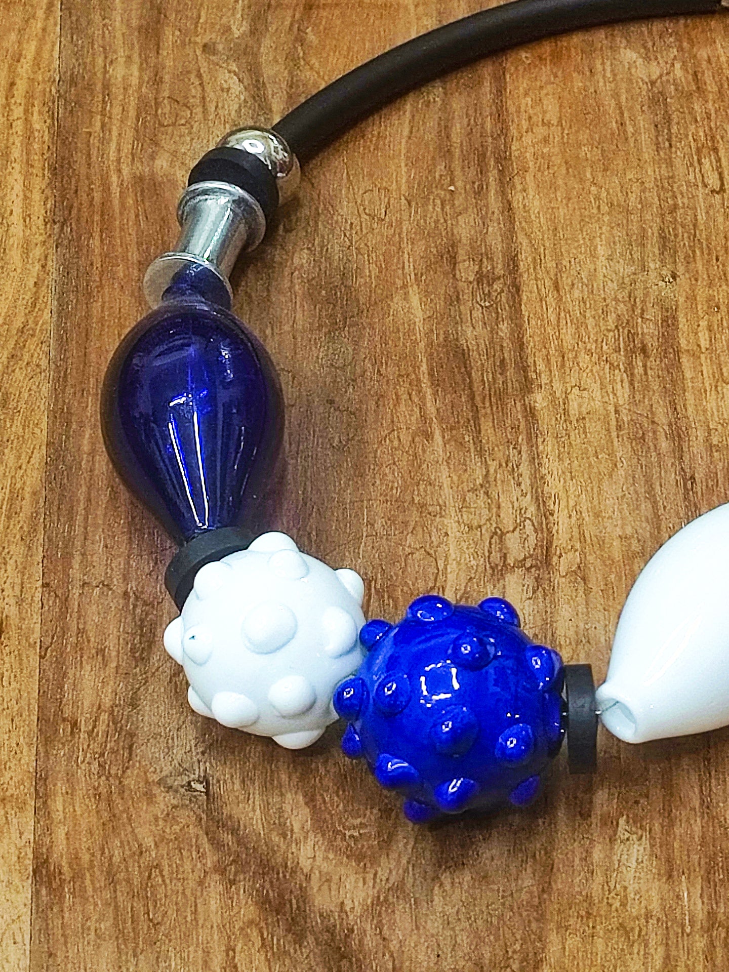 Un girocollo ispirato ai colori del mare, arricchito da eleganti perle in vetro di Murano a forma di riccio e da perle allungate che evocano le conchiglie, declinate in sfumature di blu intenso e bianco.