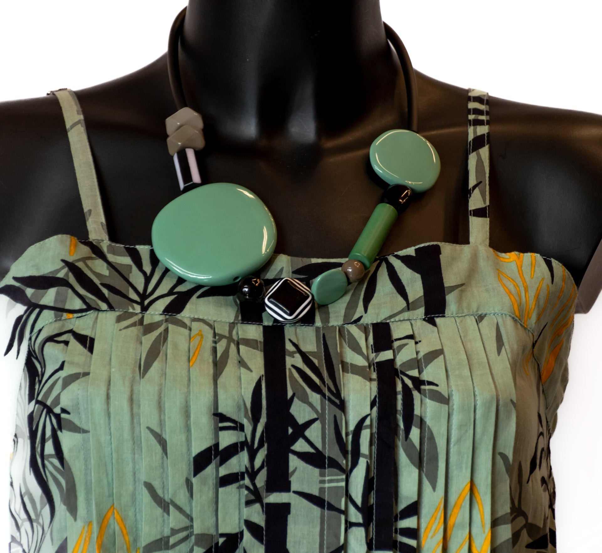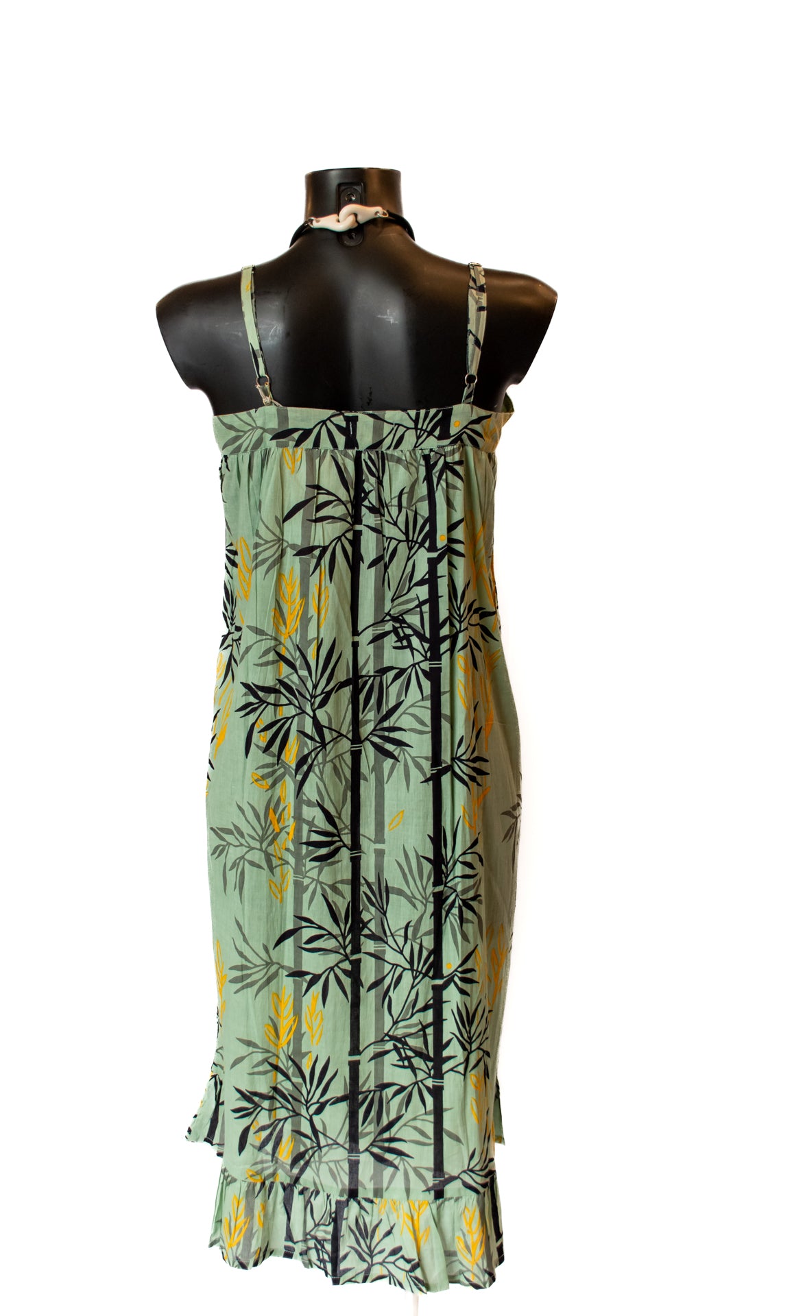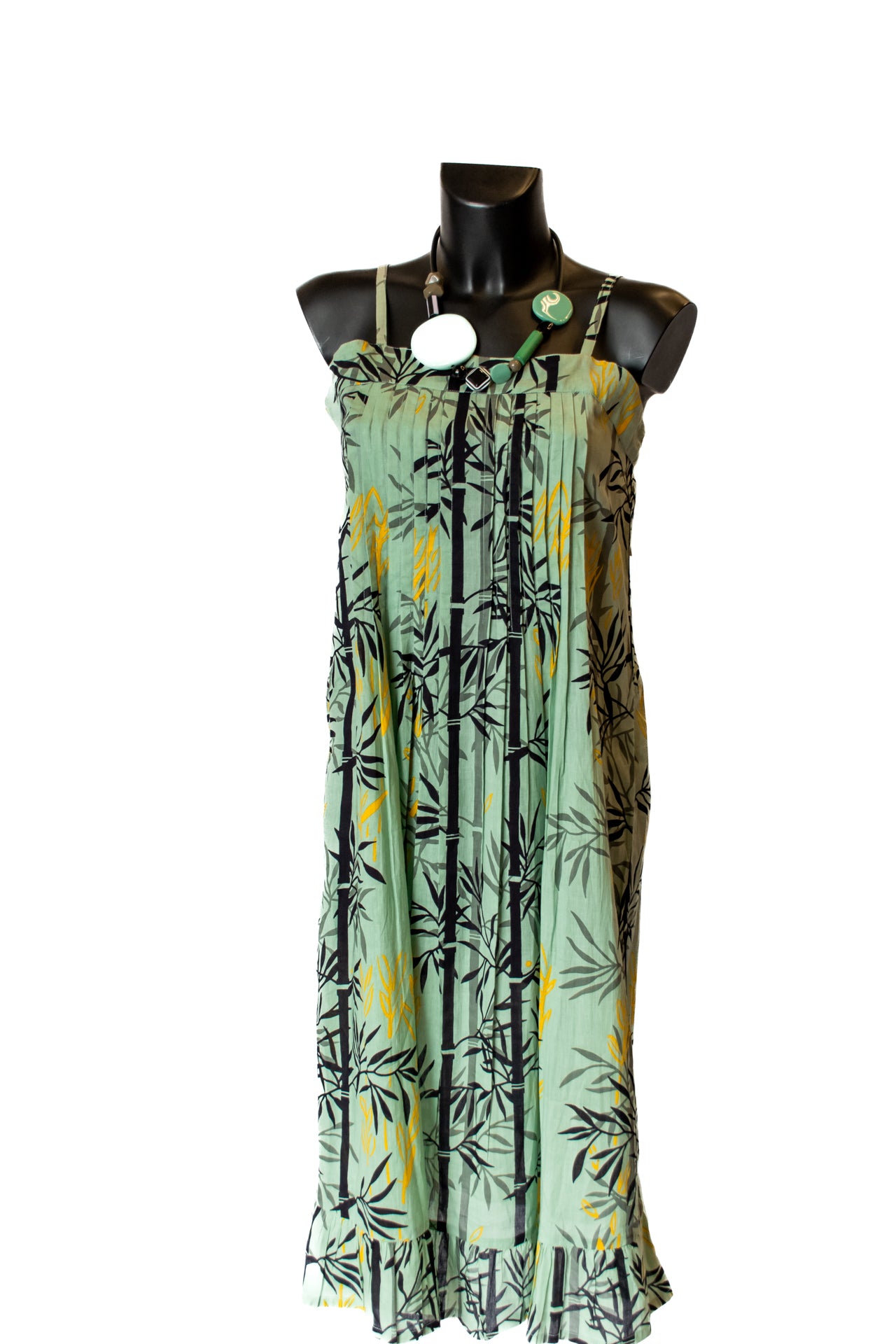 Vestito midi prendisole che si estende oltre il ginocchio, confezionato in cotone verde chiaro e arricchito da disegni di canne di bambù in sfumature di nero e giallo tenue.