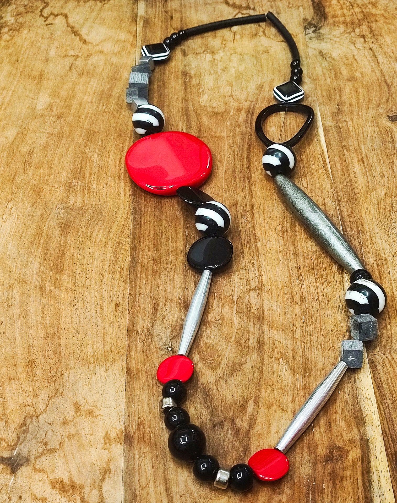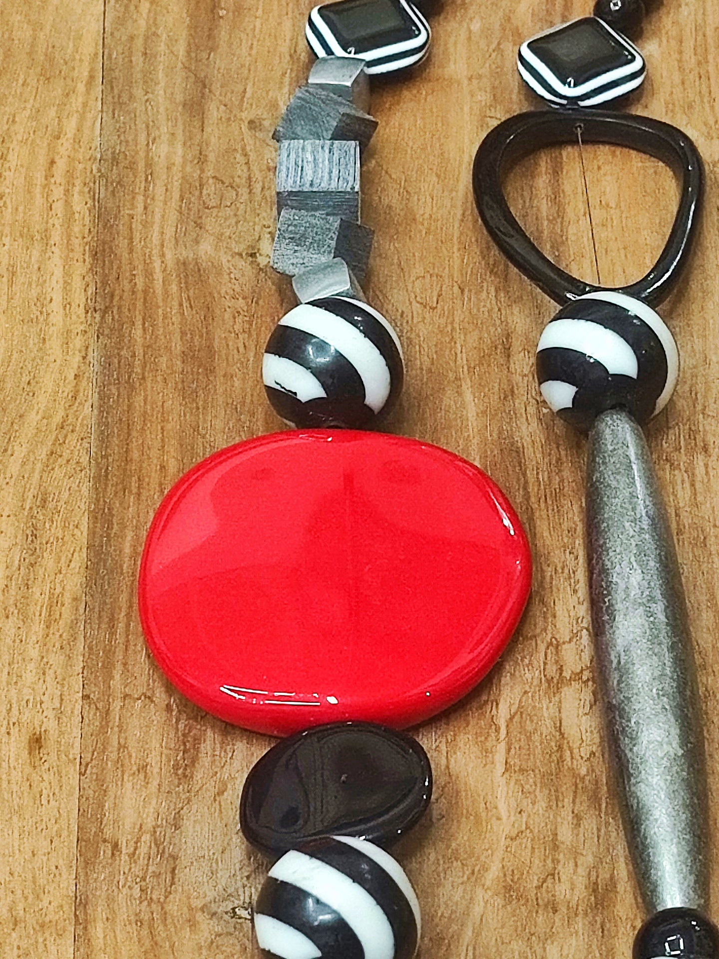 Collana lunga caratterizzata da un gioco di colori rosso, nero e argento che conferisce un aspetto elegante, con forme allungate in vetroresina intrecciate e dettagli in conchiglia e caucciù.