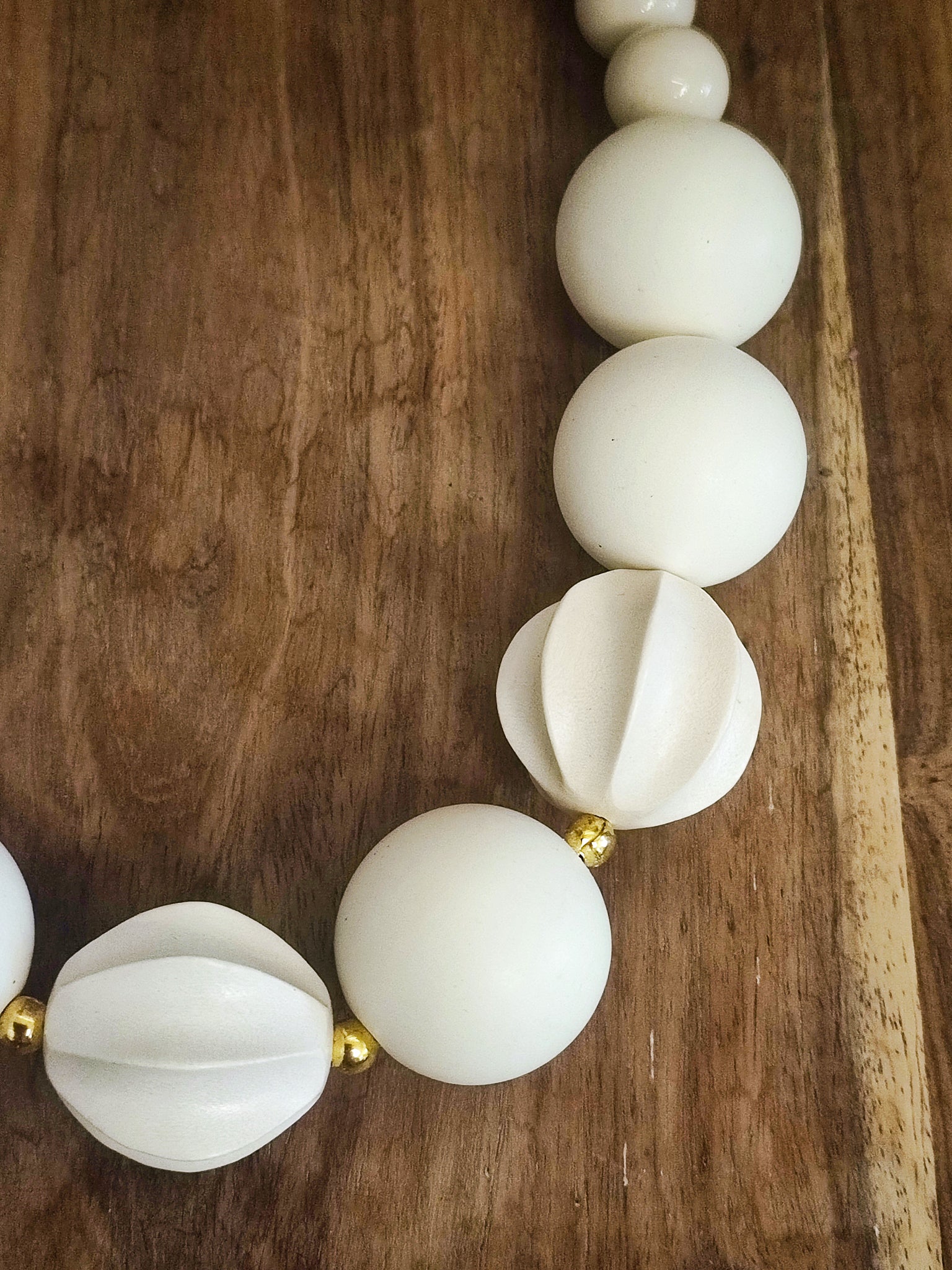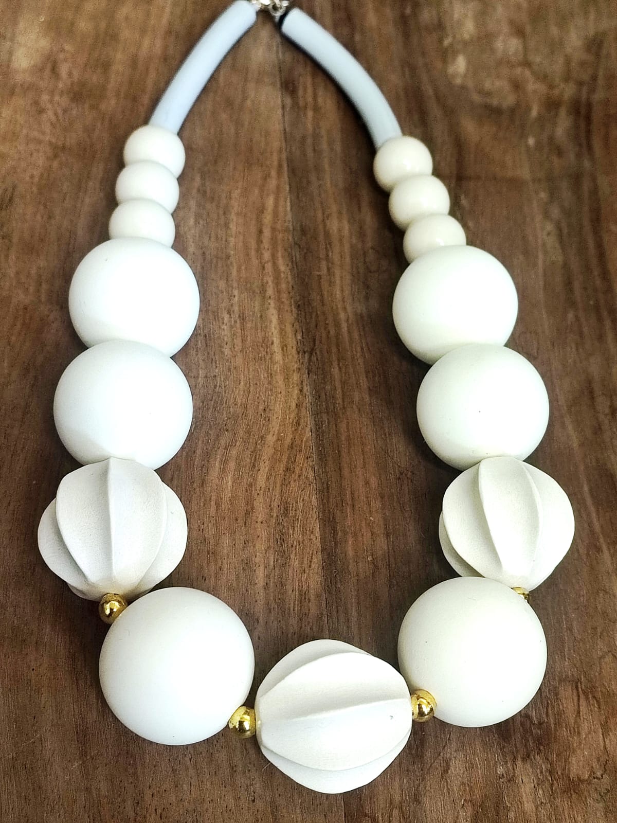 Collana girocollo caratterizzata da perle rotonde e sfaccettate in legno bianco. Un accessorio dall'elevato impatto estetico che valorizza con raffinatezza sia l'abbigliamento formale che quello informale, aggiungendo un elemento distintivo a qualsiasi outfit.
