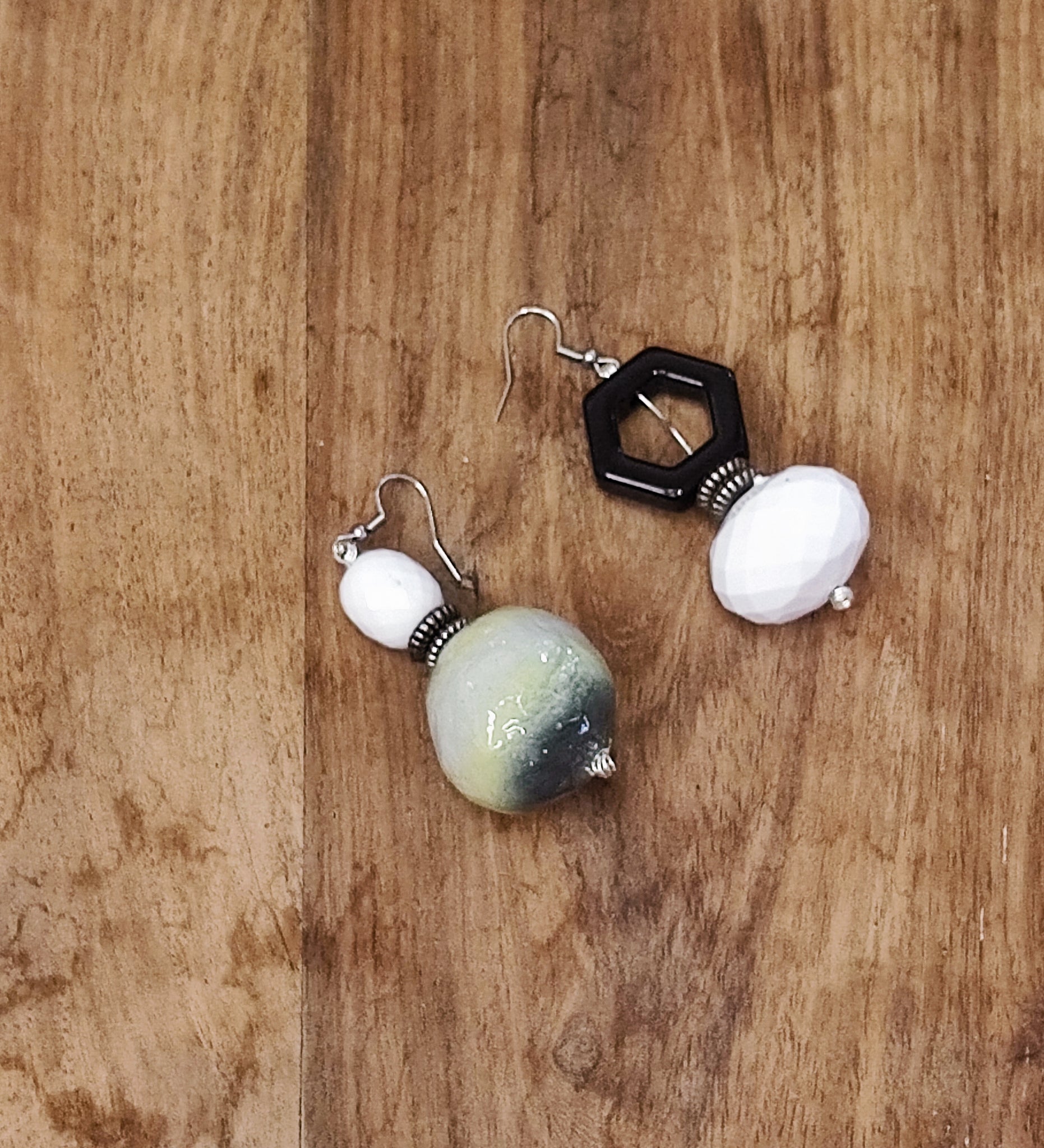 Gli orecchini asimmetrici Athena, lunghi 6 cm, combinano perle di carta pesta, vetroresina e argento indiano, aggiungendo un tocco di raffinatezza e originalità all’insieme.
