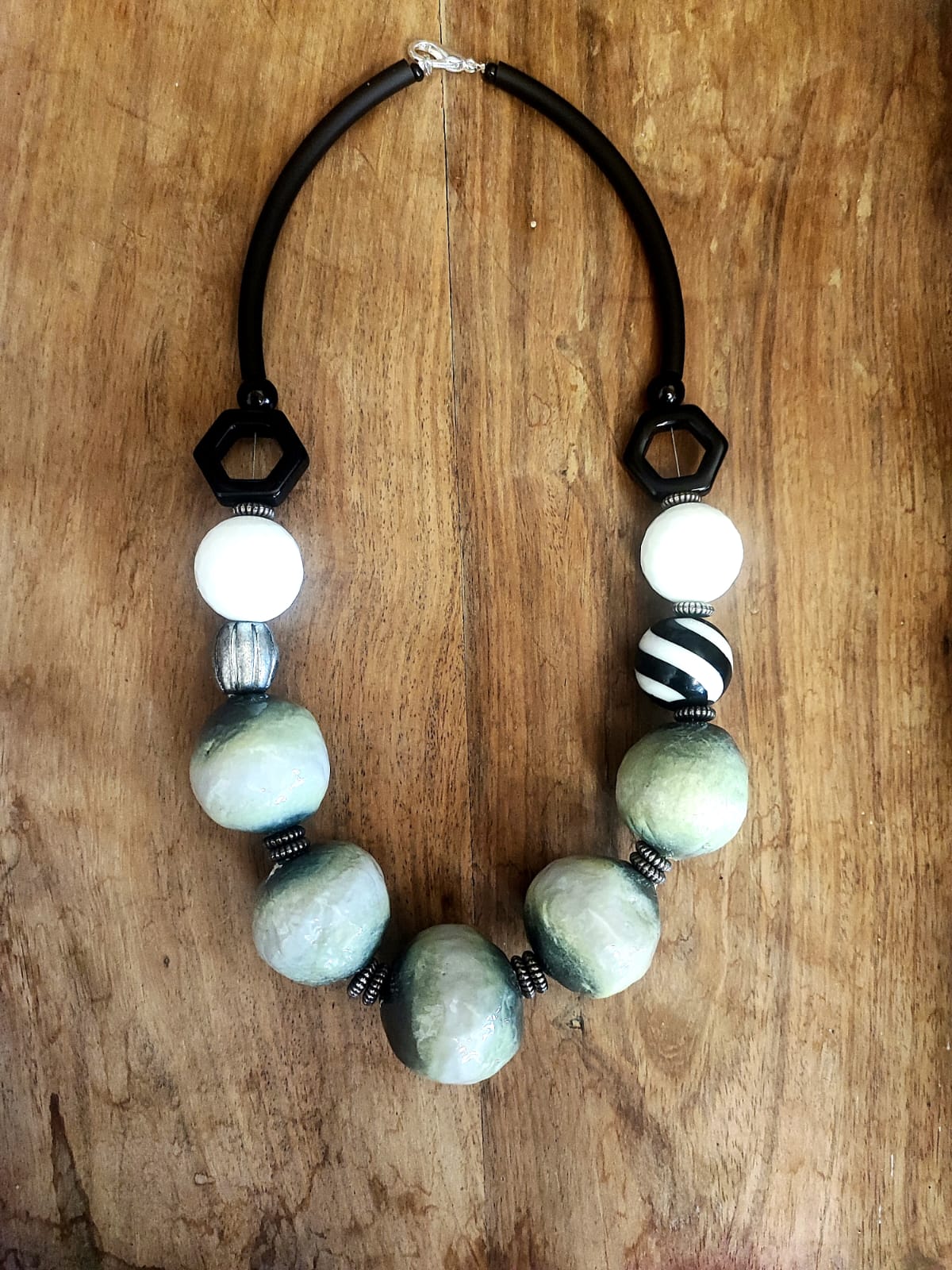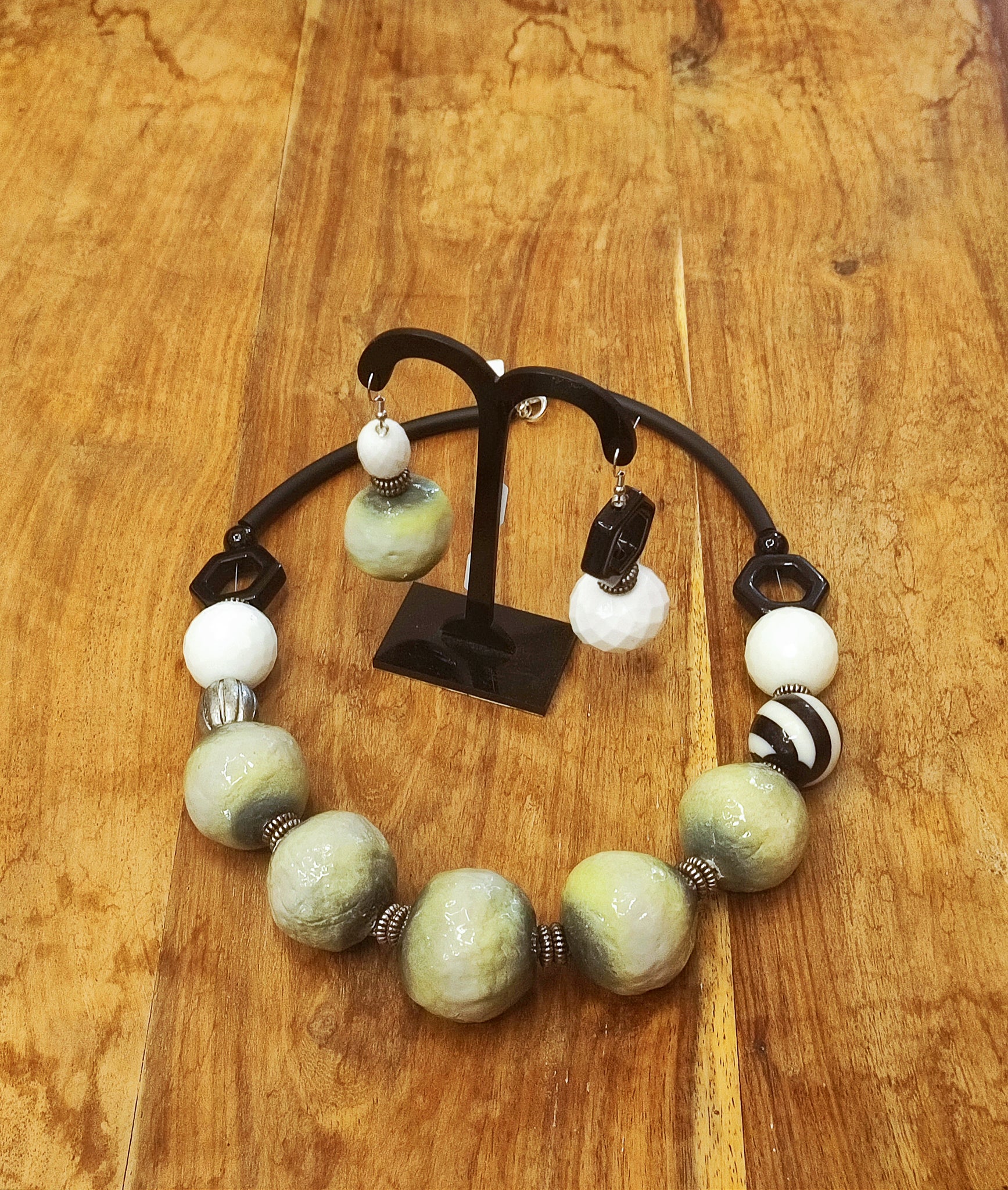 Il set collana e orecchini Athena, caratterizzato da una delicata tonalità grigio/verde, si distingue per l’uso innovativo dei materiali. Il girocollo presenta perle di carta pesta di grandi dimensioni, accompagnate da una progressione di perle in vetroresina, quarzo e dettagli in argento indiano, che conferiscono un aspetto elegante e distintivo.