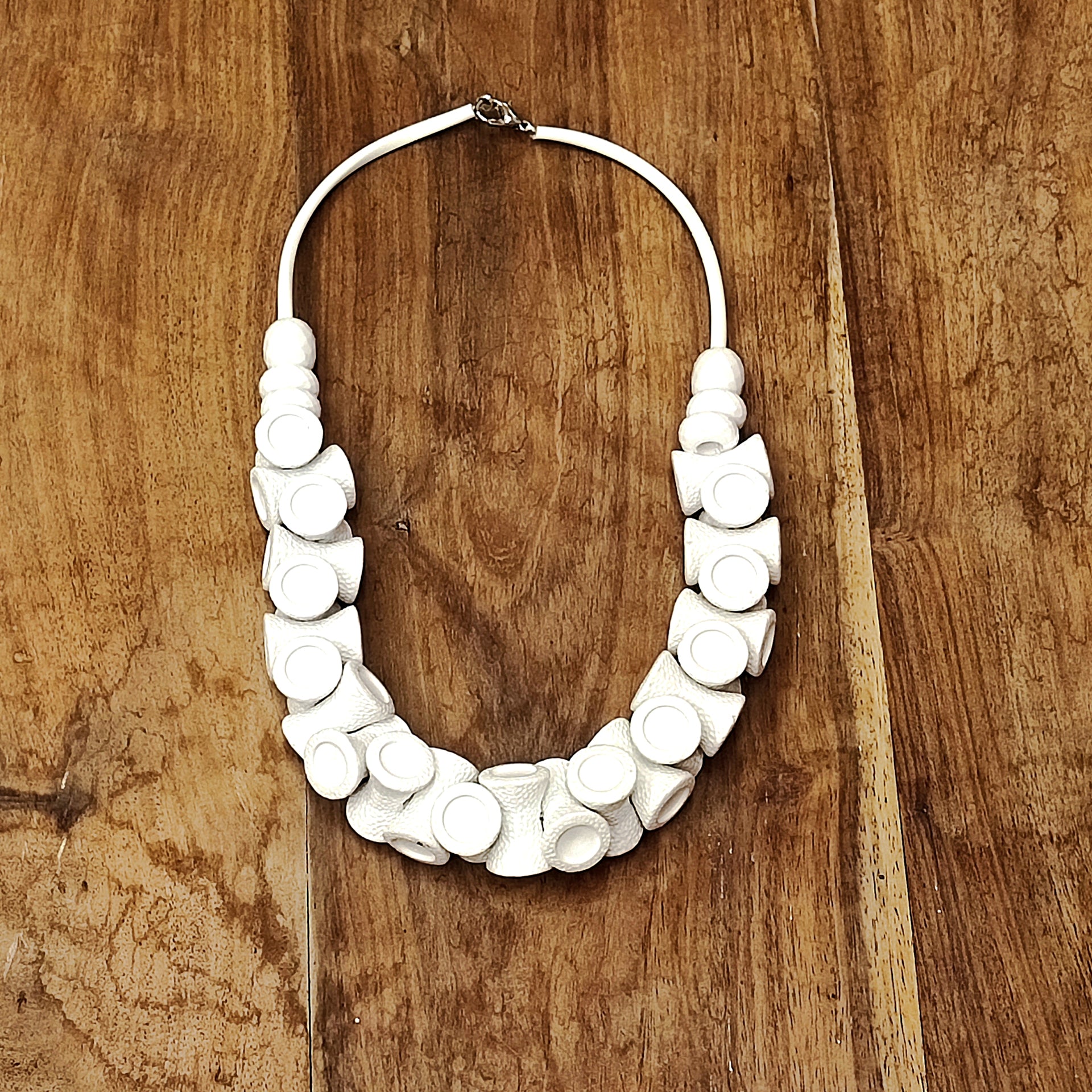 Collana girocollo in cauciù con elementi cilindrici in resina bianchi.