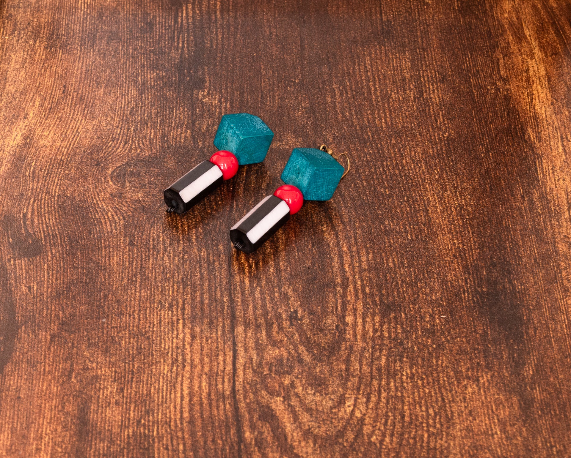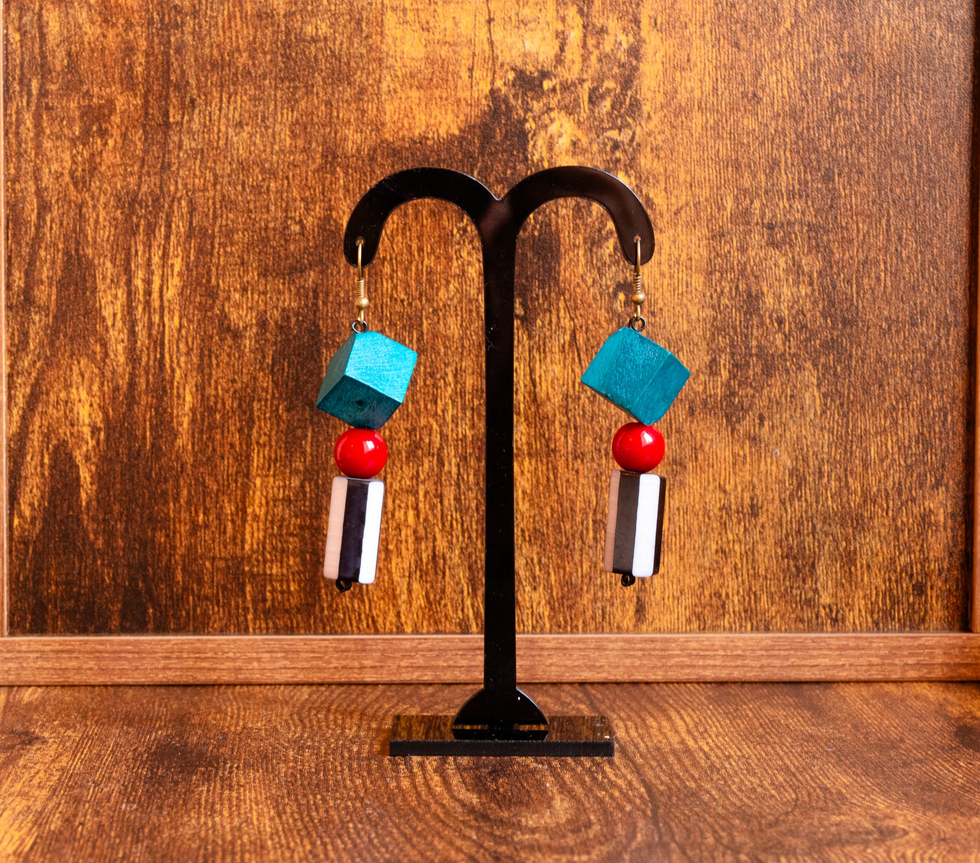Orecchini pendenti caratterizzati da un design unico che unisce un cubo in legno blu a un cilindro realizzato in vetroresina bianca e nera.
