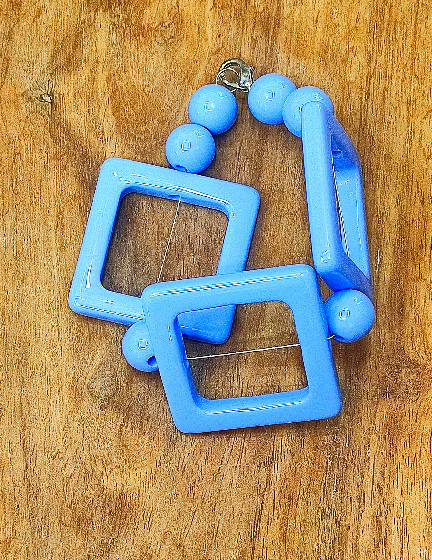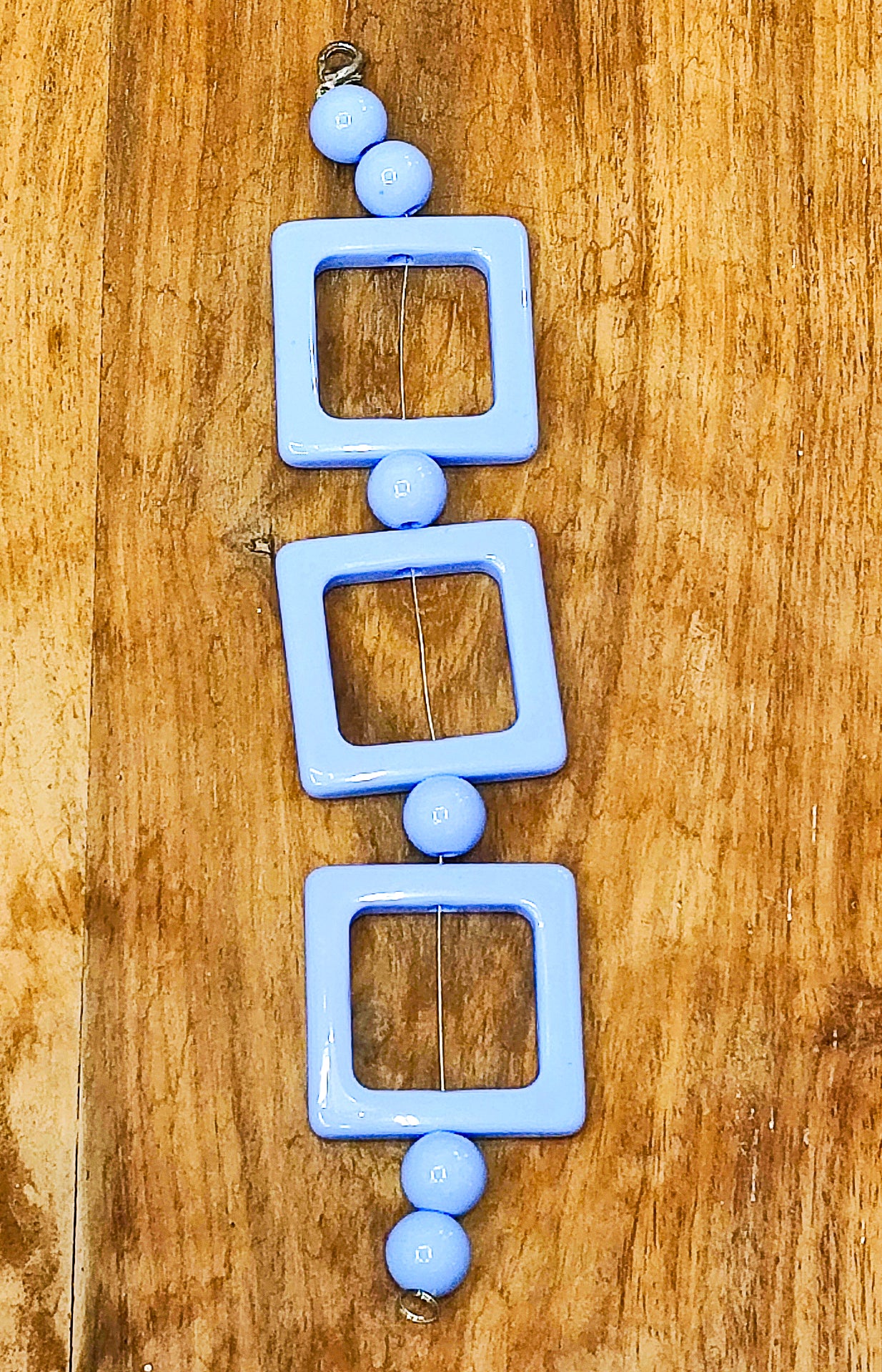 Un bracciale versatile, perfetto per accompagnare sia outfit casual che eleganti, caratterizzato da un raffinato alternarsi di forme quadrate vuote e perle tonde nel delicato tono azzurro pervinca.