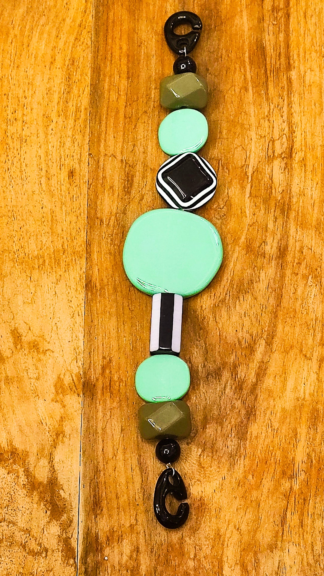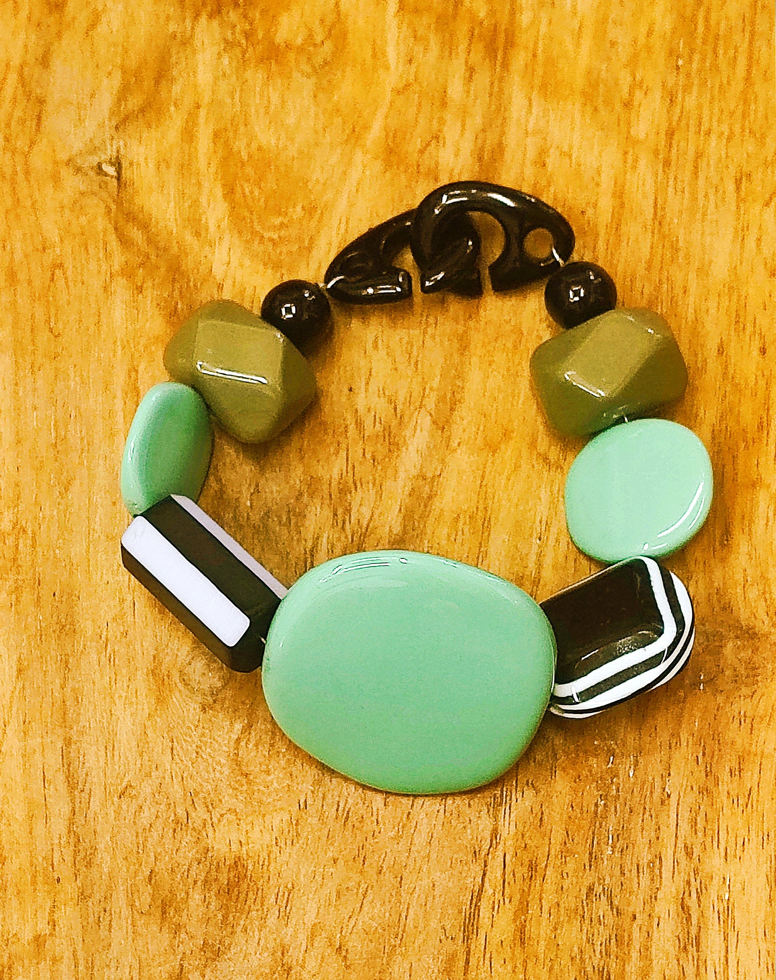 Bracciale raffinato realizzato in vetroresina, caratterizzato da forme quadrate piatte di colore verde salvia, intervallate da perle ovali nere con venature bianche e perle cubiche di un verde scuro intenso.