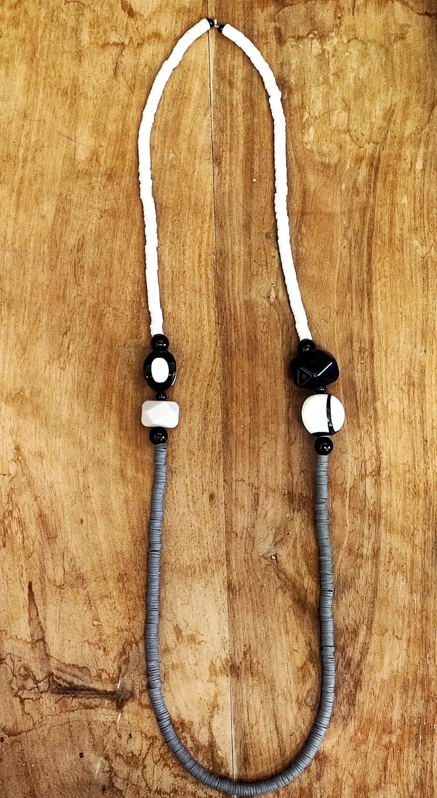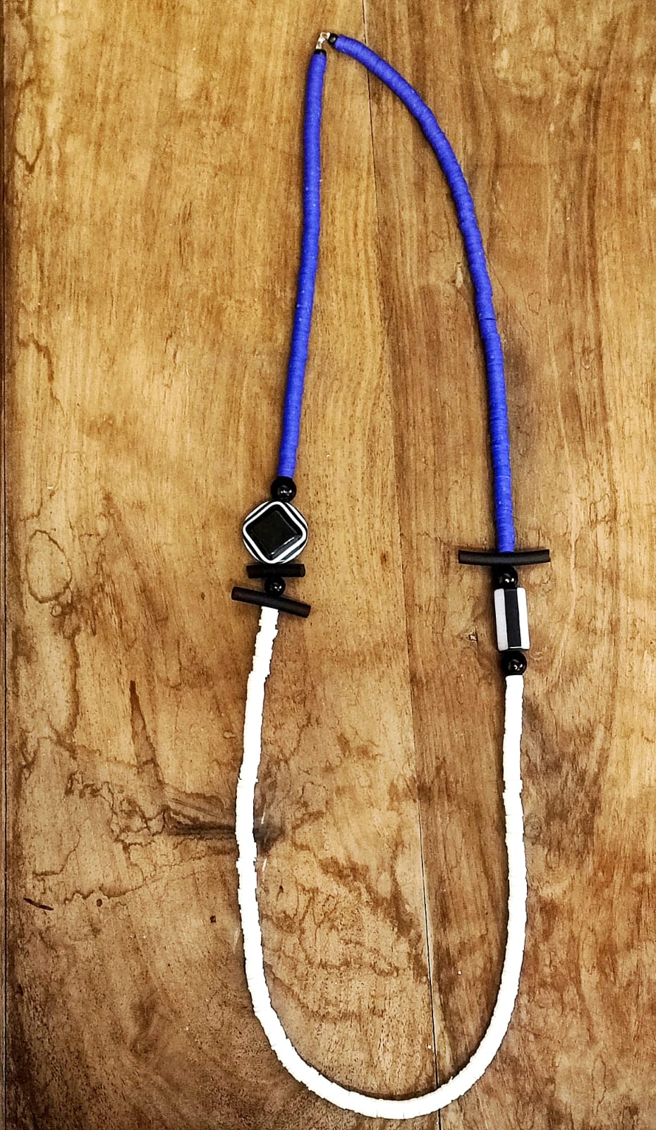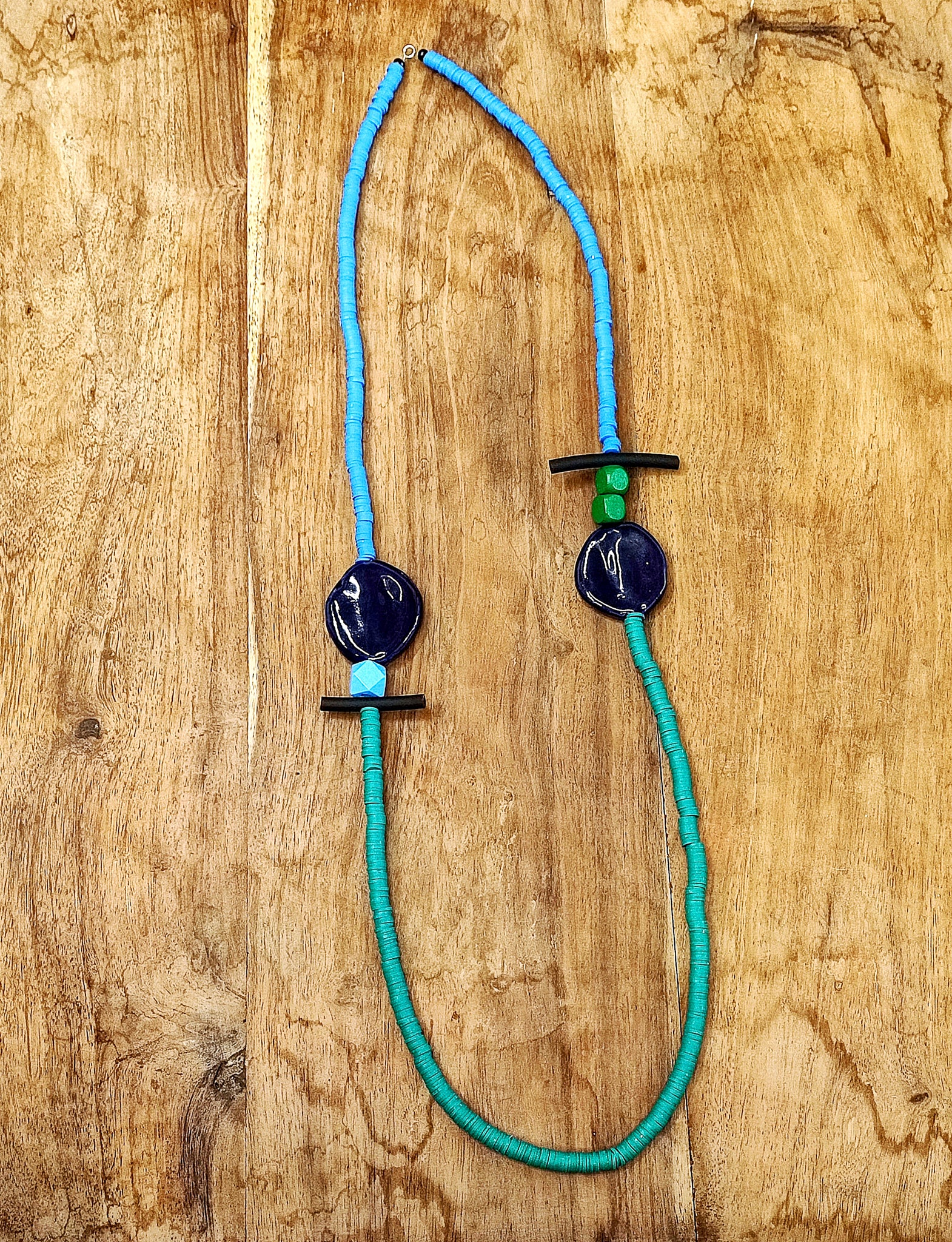 Raffinata collana lunga a filo bicolore, caratterizzata da dettagli geometrici in vetro resina. L'estetica essenziale e minimalista conferisce un impatto visivo distintivo.