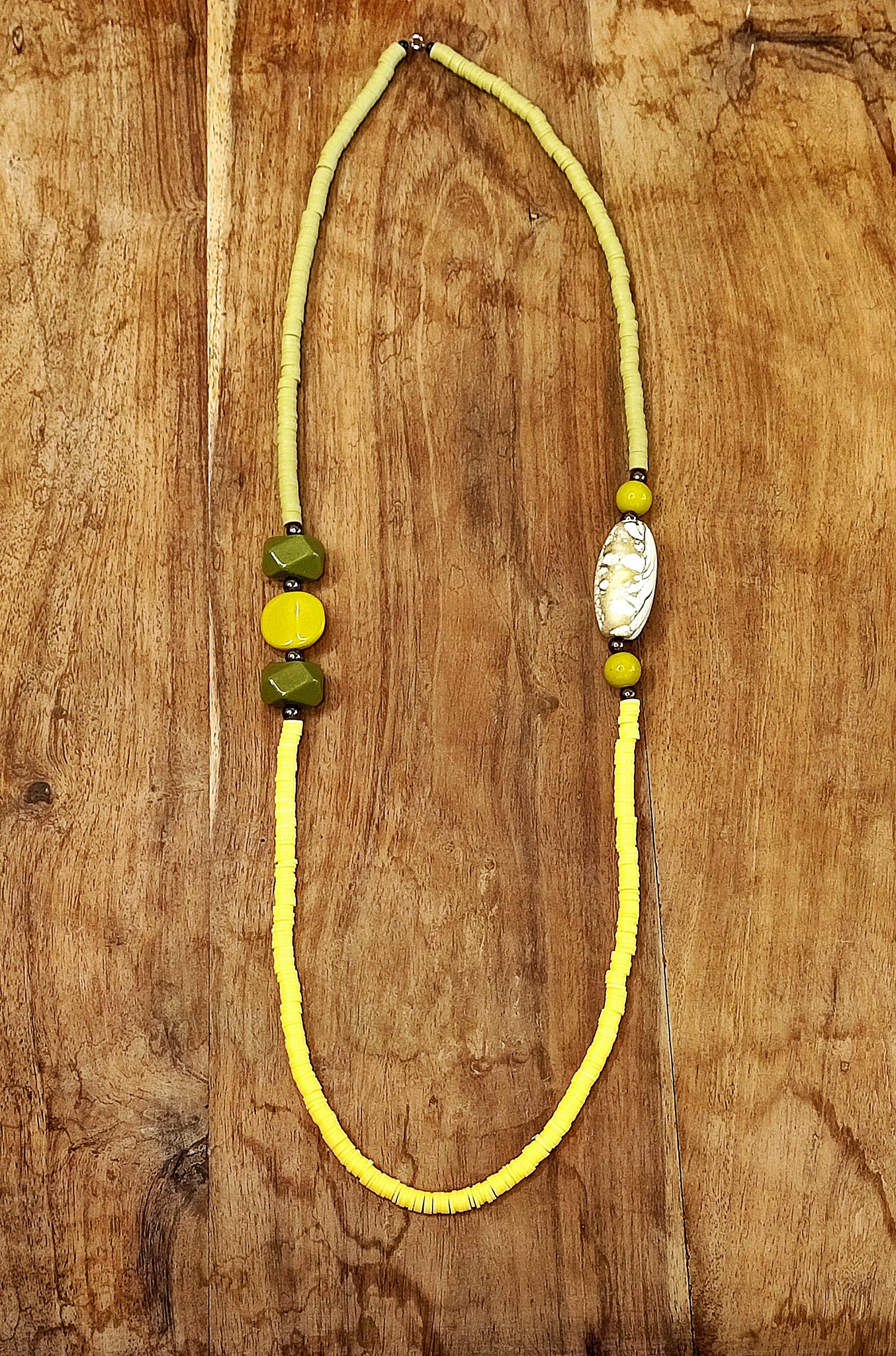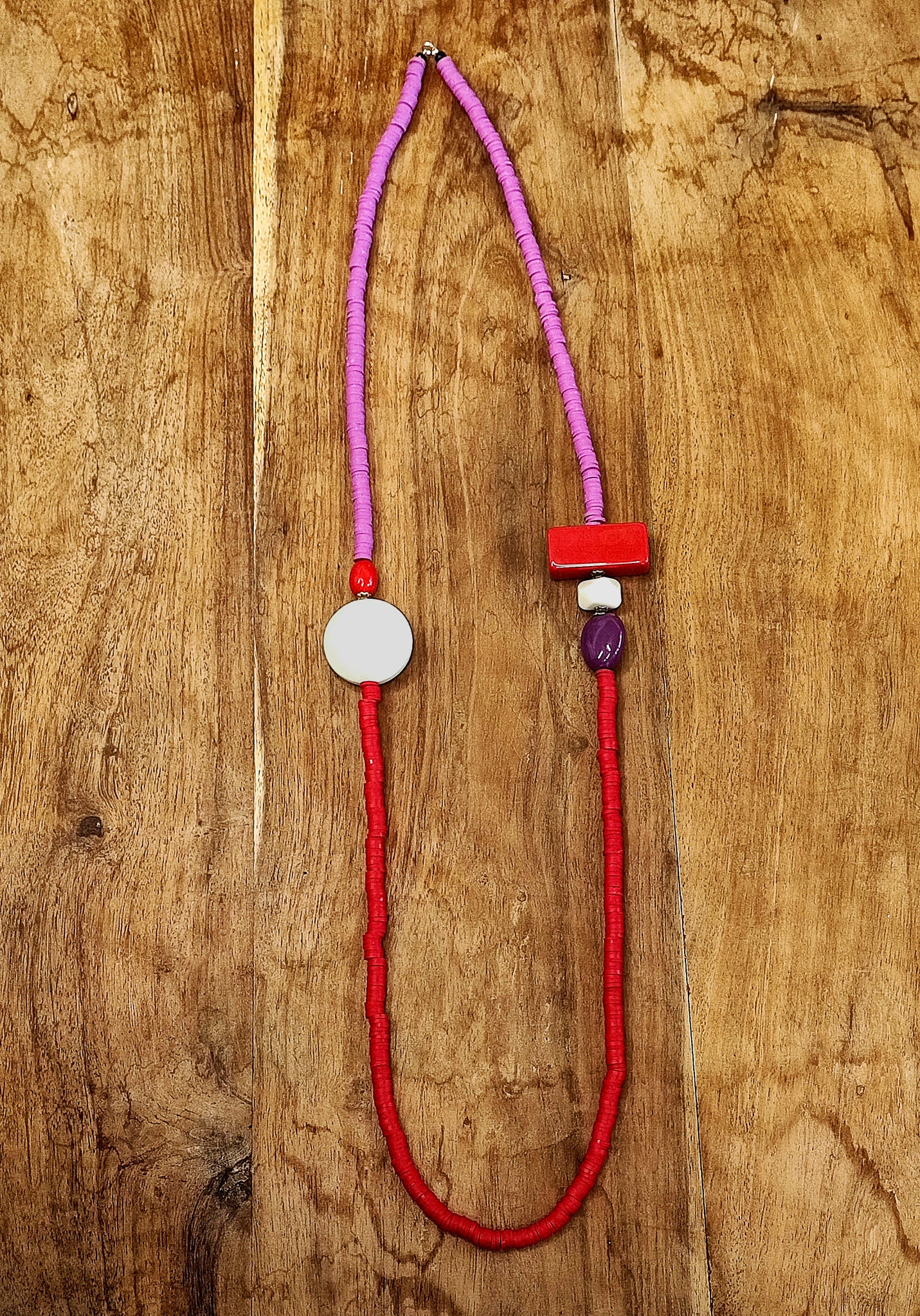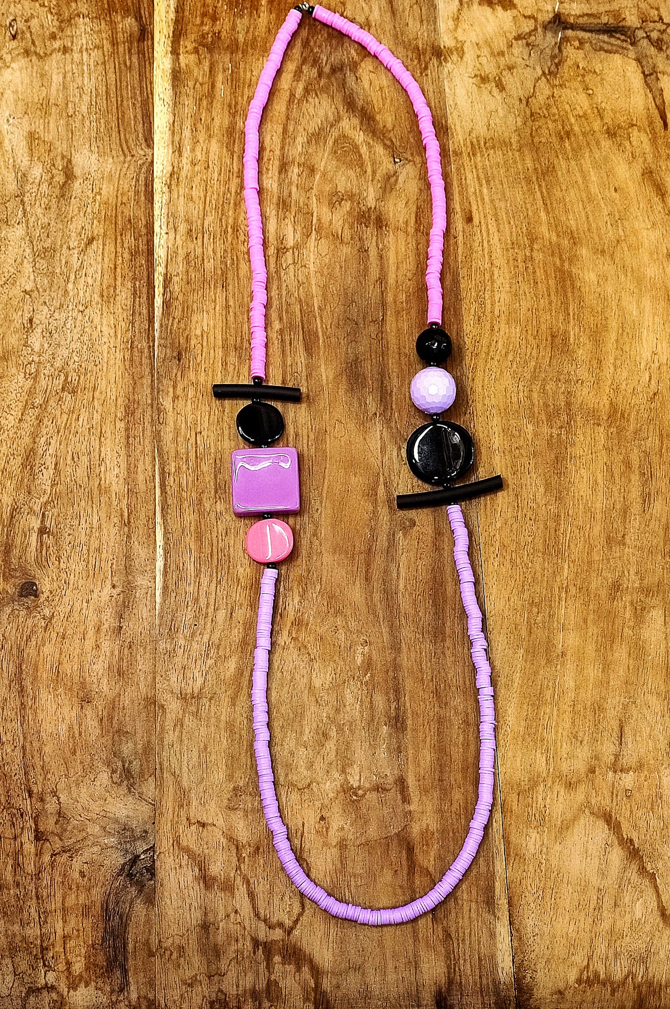 Raffinata collana lunga a filo bicolore, caratterizzata da dettagli geometrici in vetro resina. L'estetica essenziale e minimalista conferisce un impatto visivo distintivo.