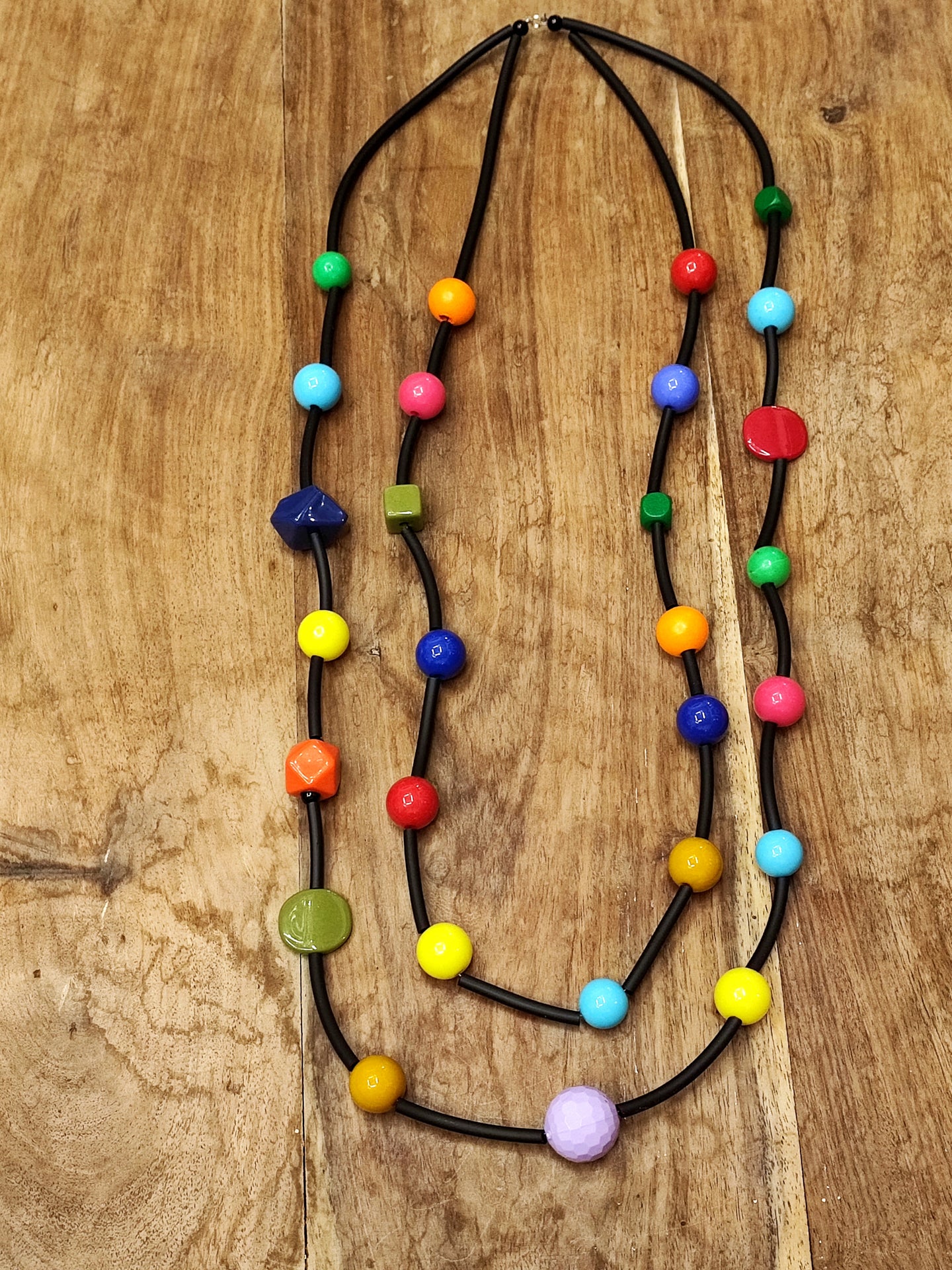 Collana vivace e lunga composta da due fili in caucciù, arricchita da perle rotonde in vetroresina di vari colori alternate.