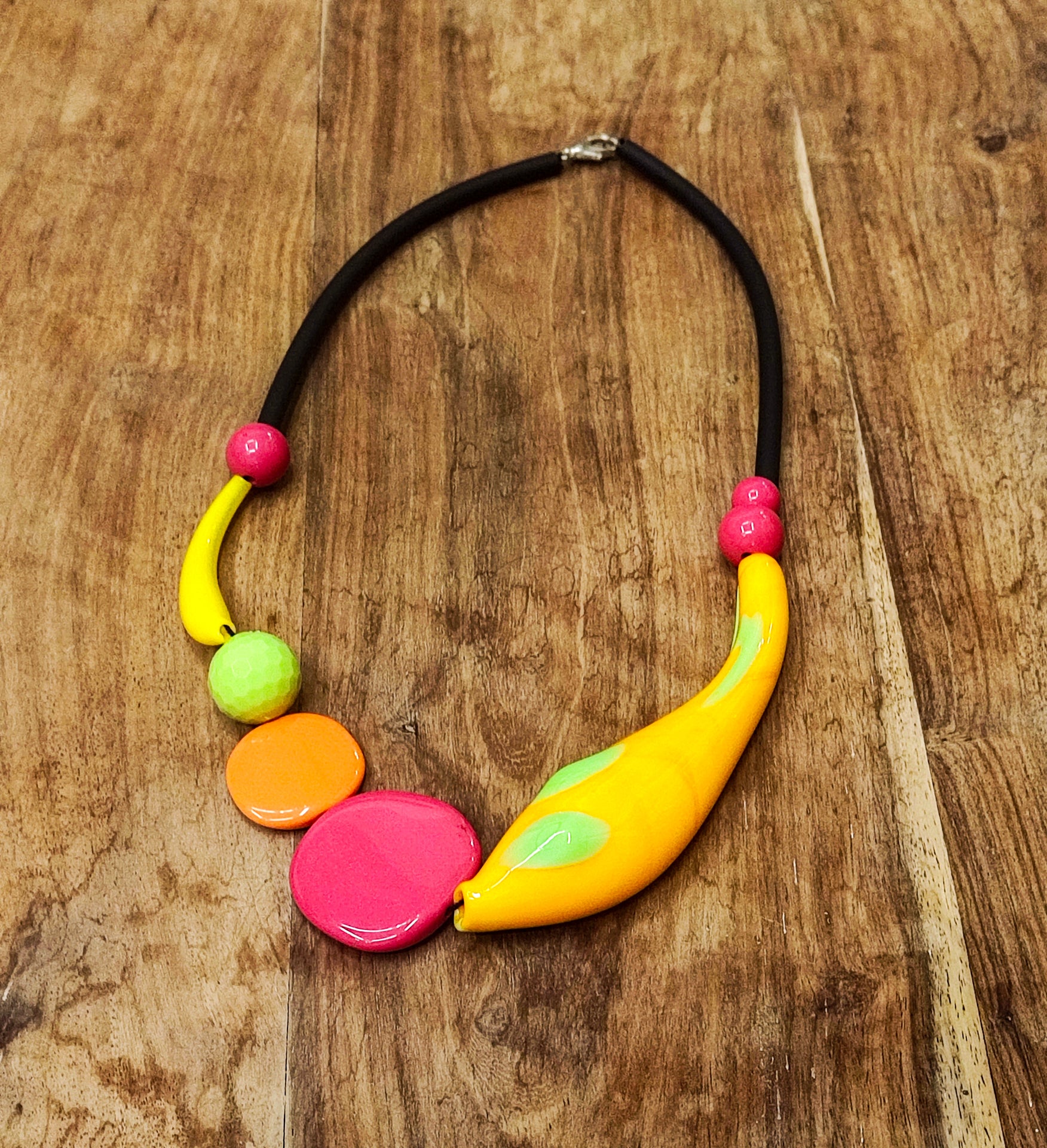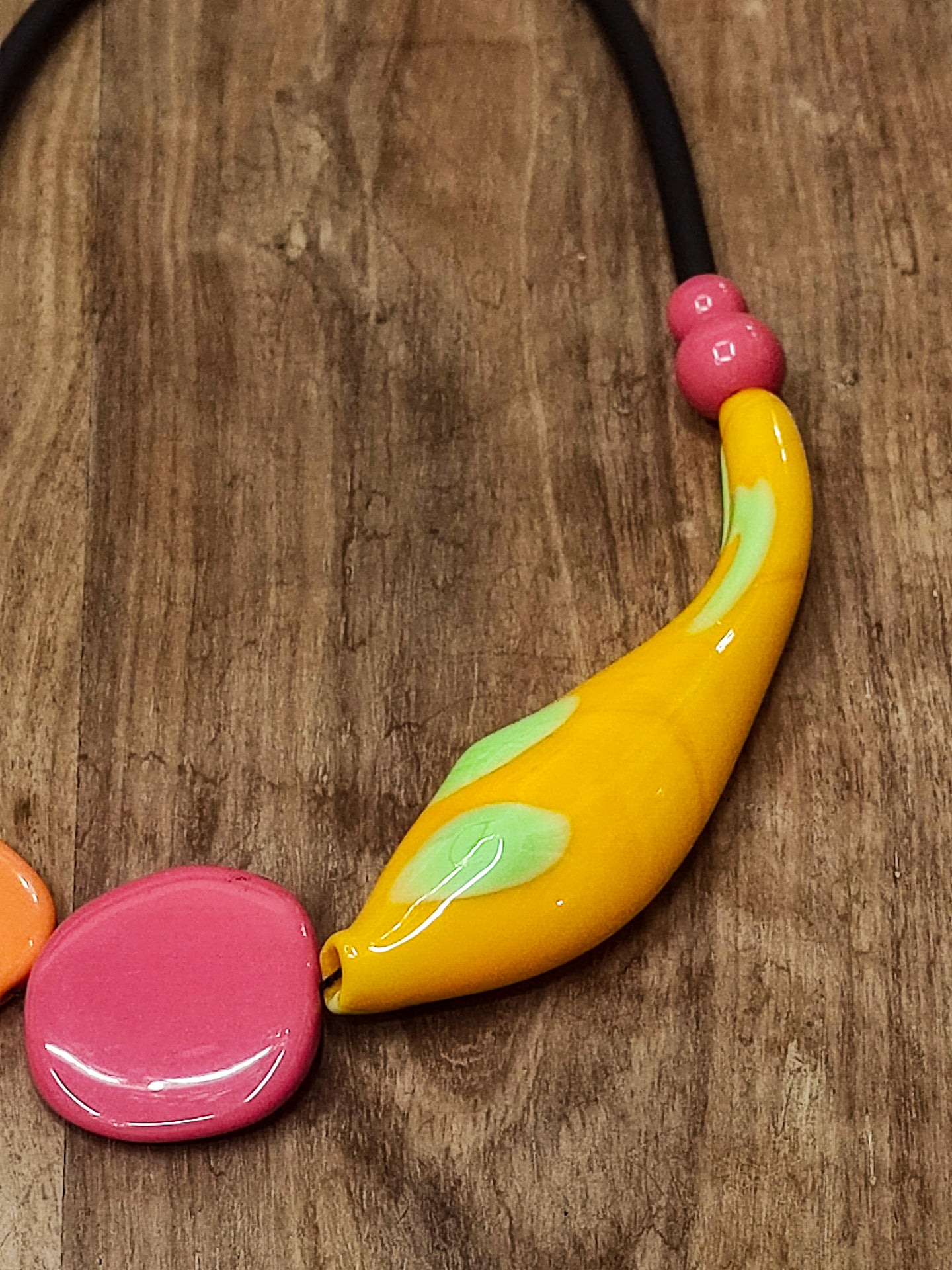 Un girocollo realizzato in vetro di Murano, caratterizzato da tonalità estive di giallo e arancione e da eleganti forme curve che avvolgono delicatamente il collo.