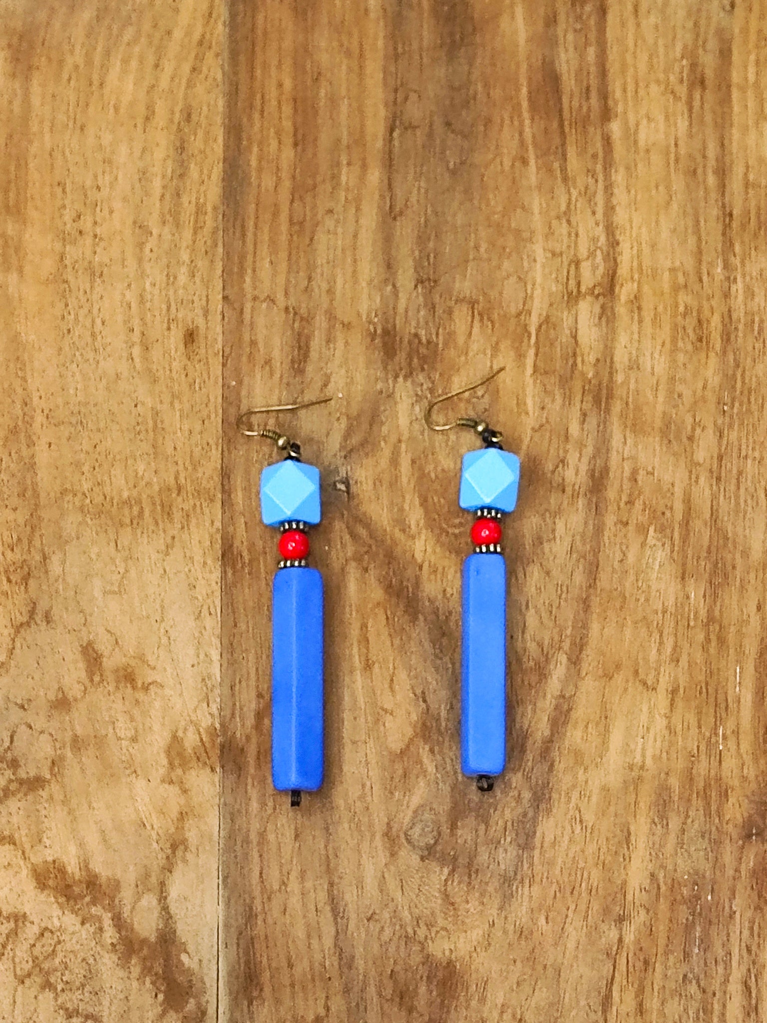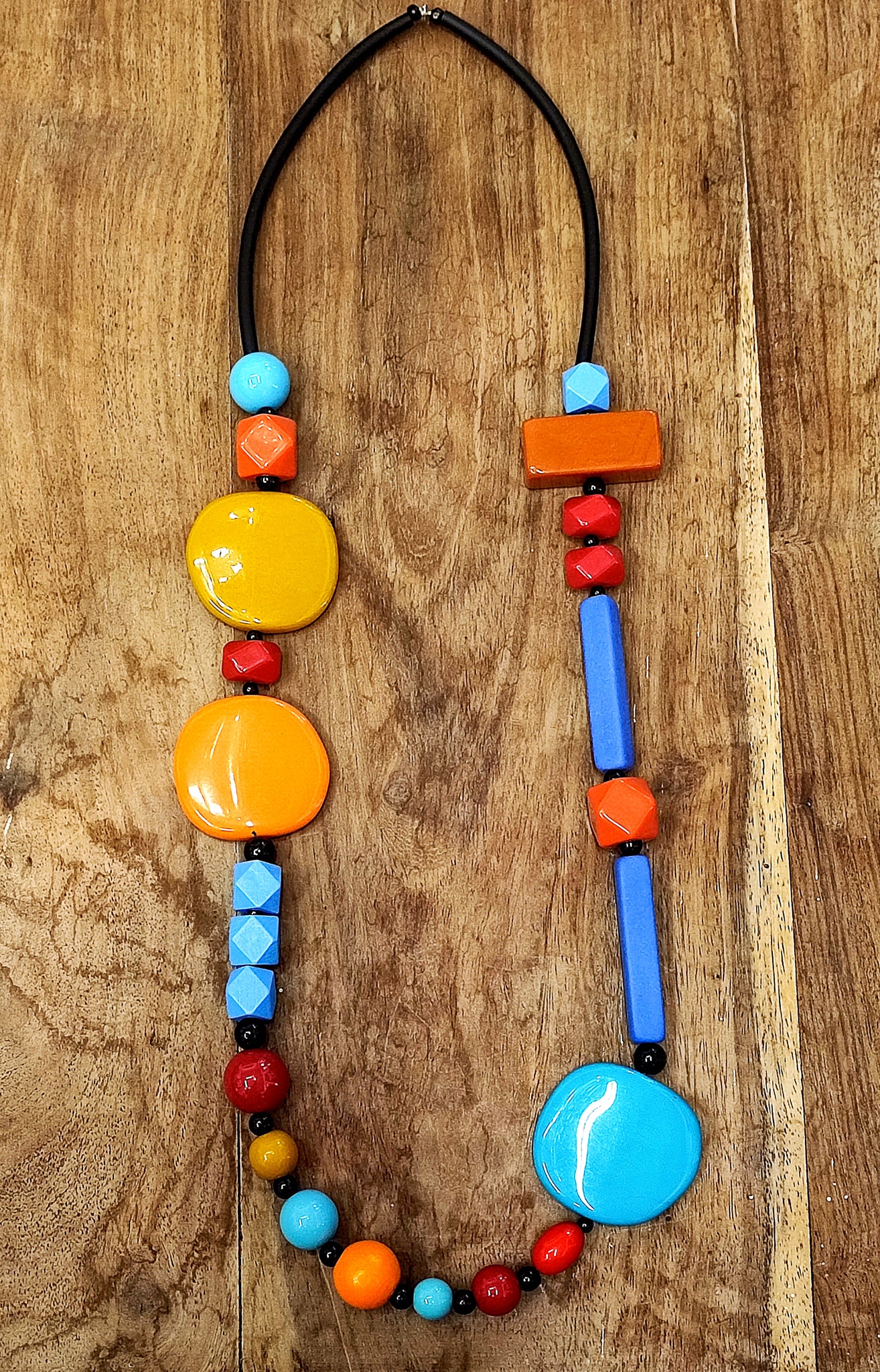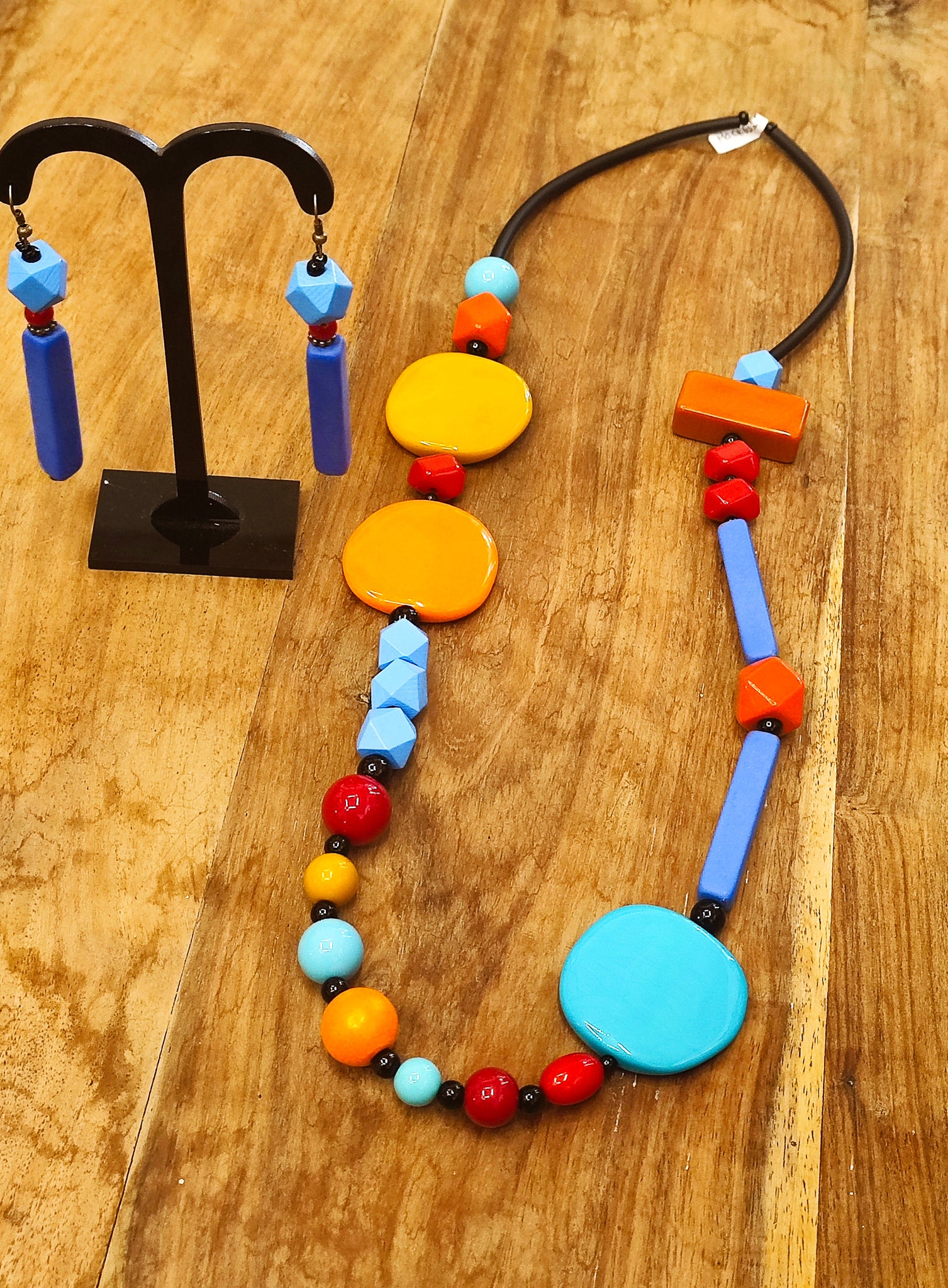 Collana lunga caratterizzata da elementi in vetroresina e legno, con tonalità vivaci di arancione e accenti di azzurro mare che richiamano atmosfere estive. Gli orecchini pendenti abbinati presentano un piccolo cilindro in legno azzurro mare e una perla in vetroresina azzurro chiaro, completando l’insieme con eleganza e freschezza.