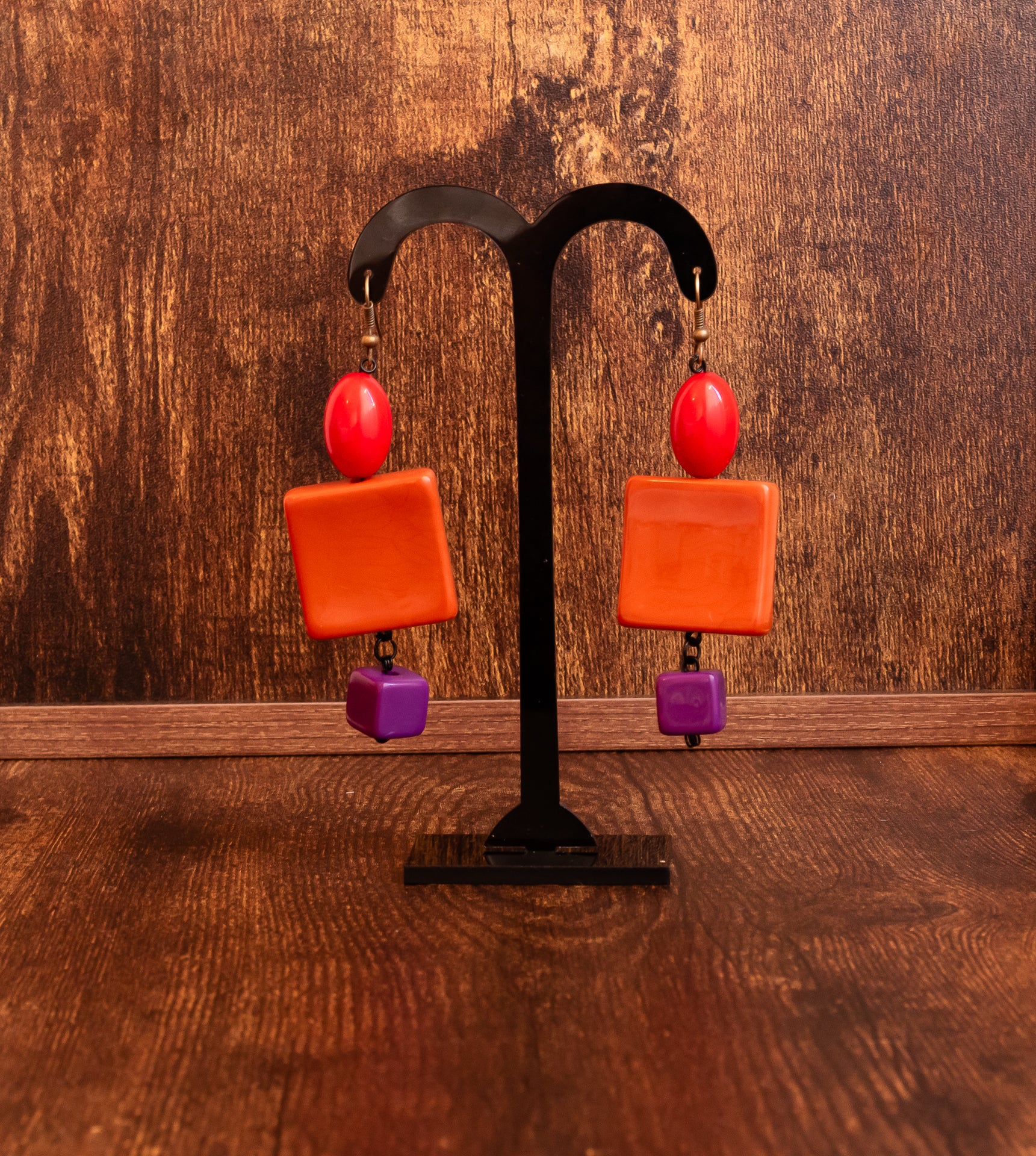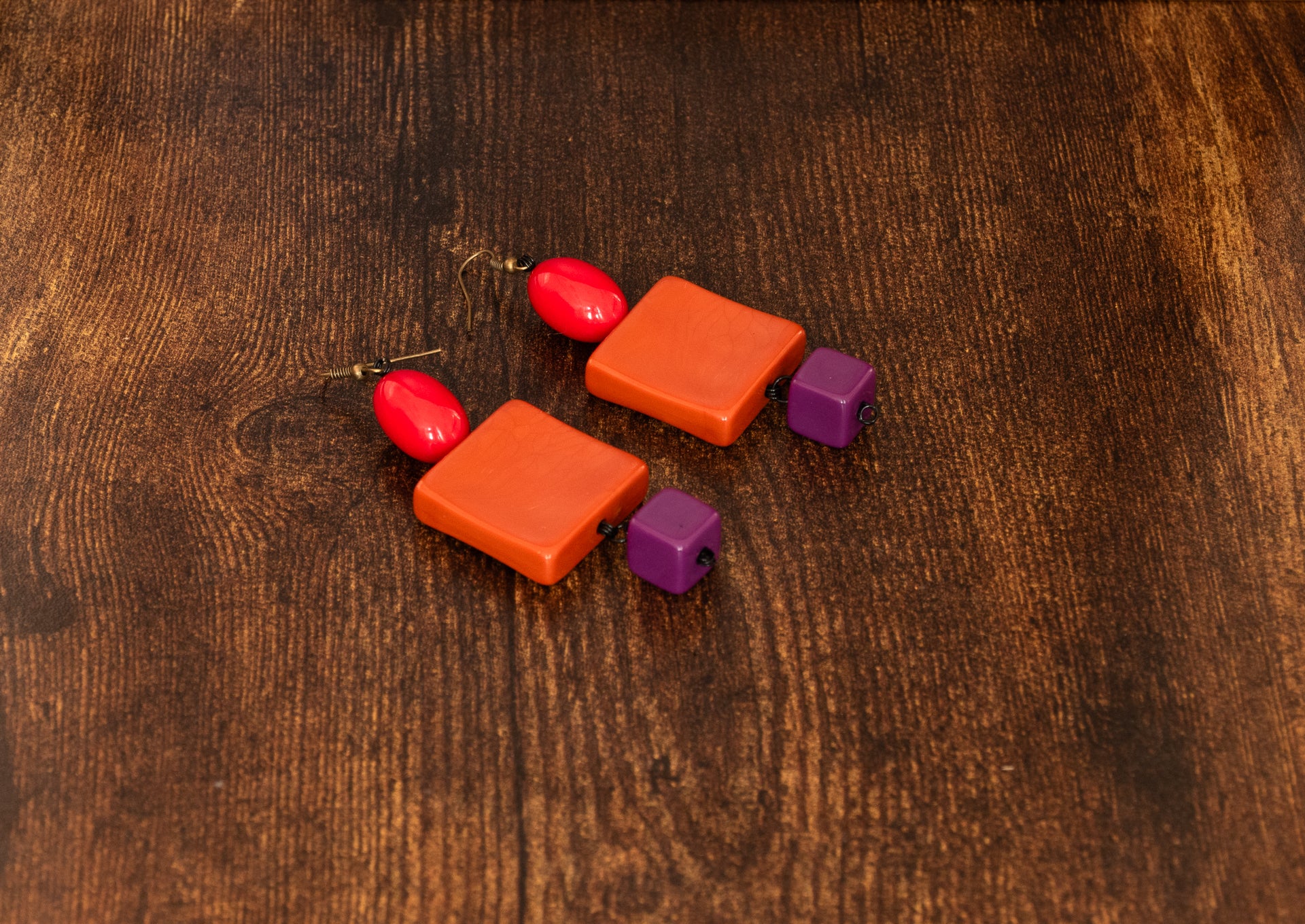 Pendenti dal sapore orientale con un gioco di forme tra quadrati e perle rotonde dai colori vivi del rosso / arancio e una punta di viola.