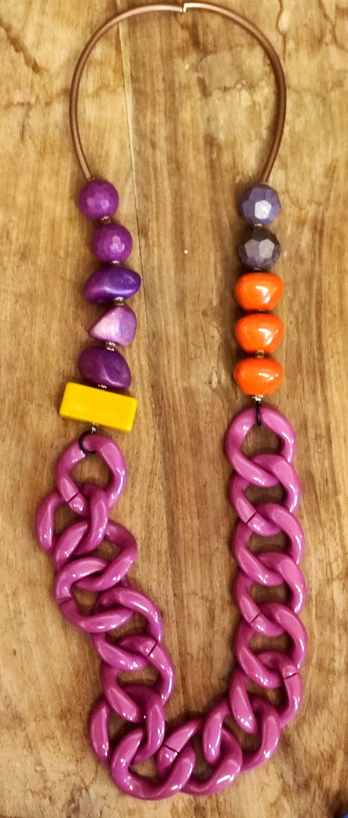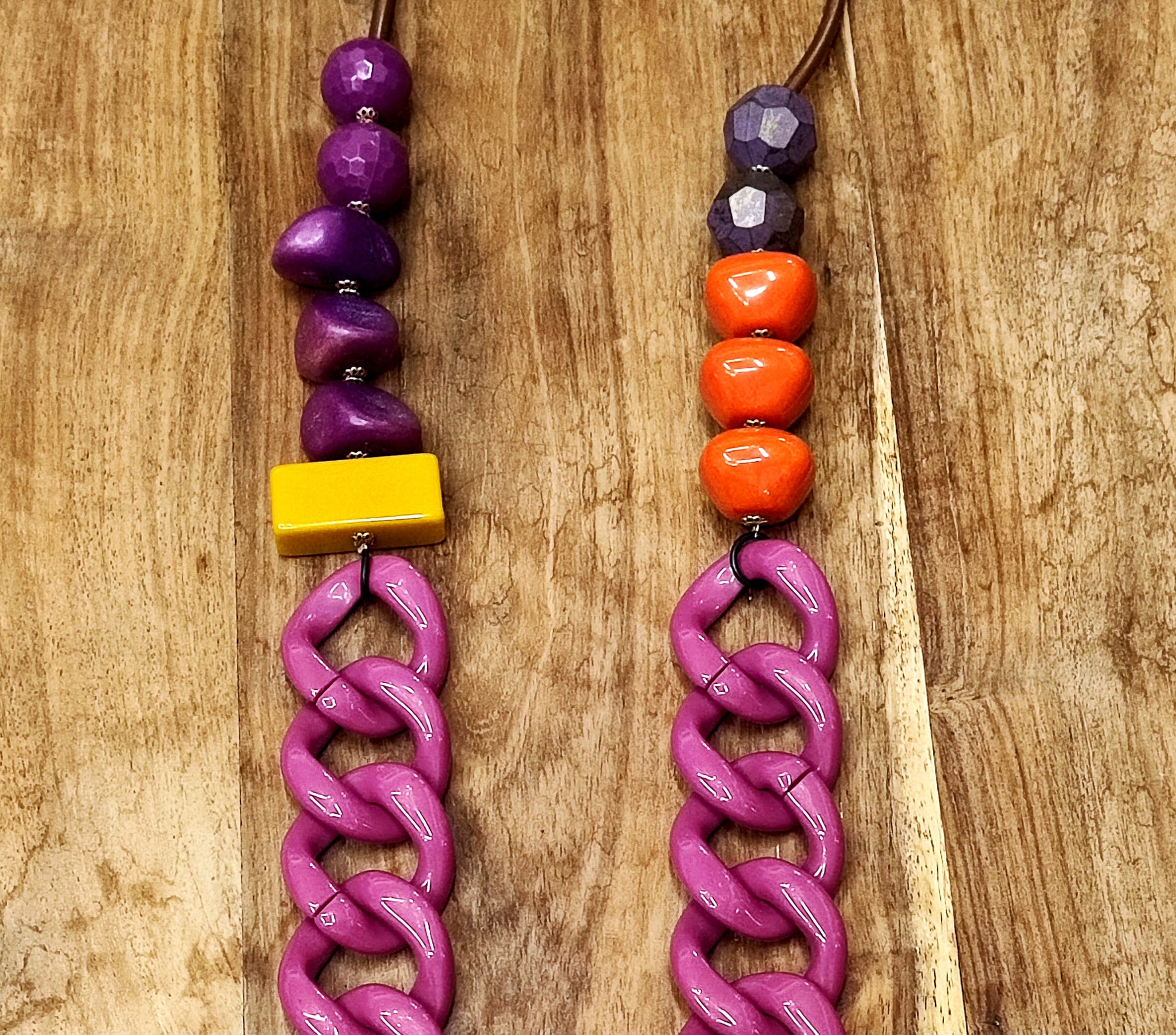 Una collana versatile che esplora le sfumature del viola, adatta per ogni stagione dell'anno. La sua composizione sofisticata unisce una catena in vetroresina con perle sferiche realizzate in vetroresina e legno, creando un equilibrio perfetto tra eleganza formale e vivacità cromatica.