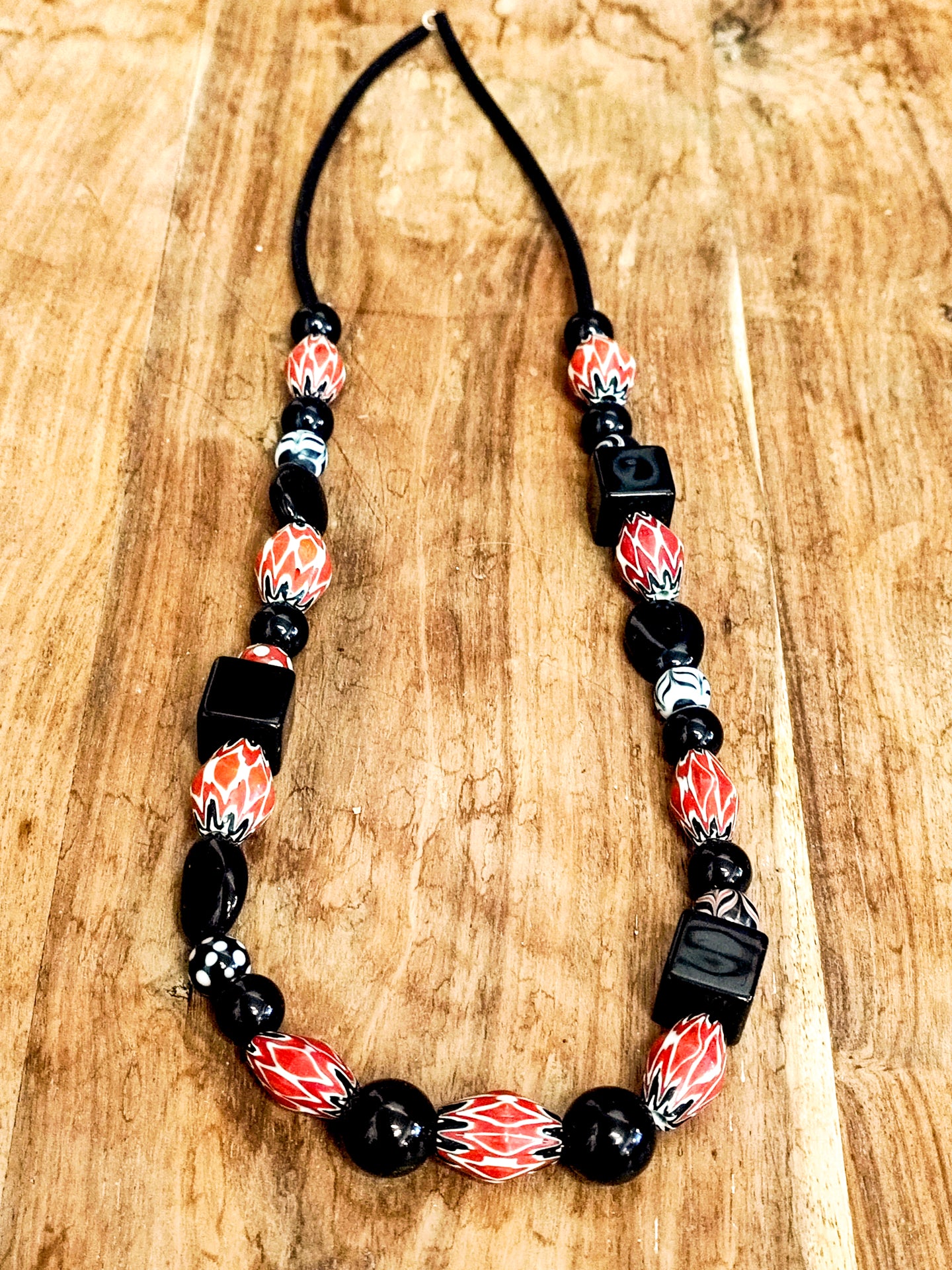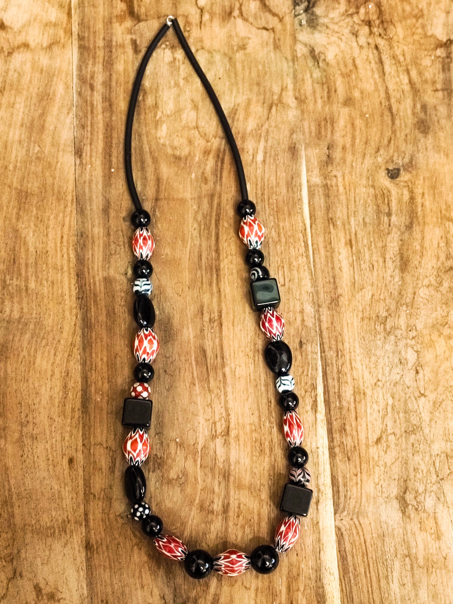 Collana lunga caratterizzata da eleganti perle ovali in vetro di Murano bianche decorate con motivi rossi, accompagnate da piccole perle quadrate in vetroresina, che conferiscono a questo gioiello un raffinato equilibrio tra forme e tonalità.
