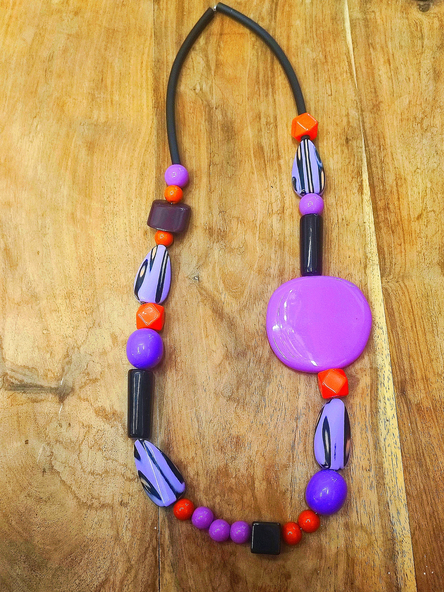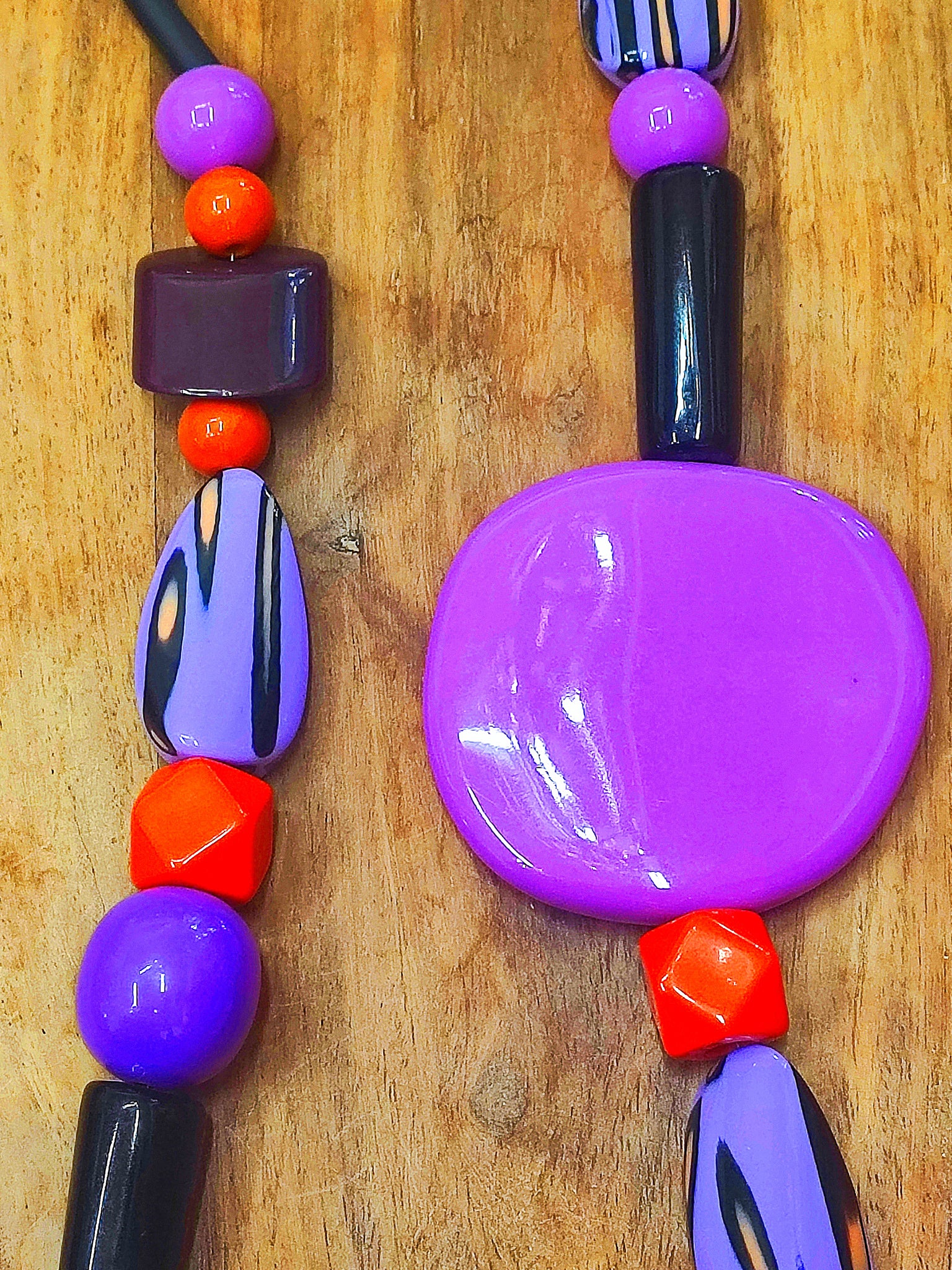 Collana lunga in sfumature di viola con accenti arancioni, caratterizzata da gocce in vetro resina alternate a inserti quadrati, che creano un equilibrio visivo armonioso.