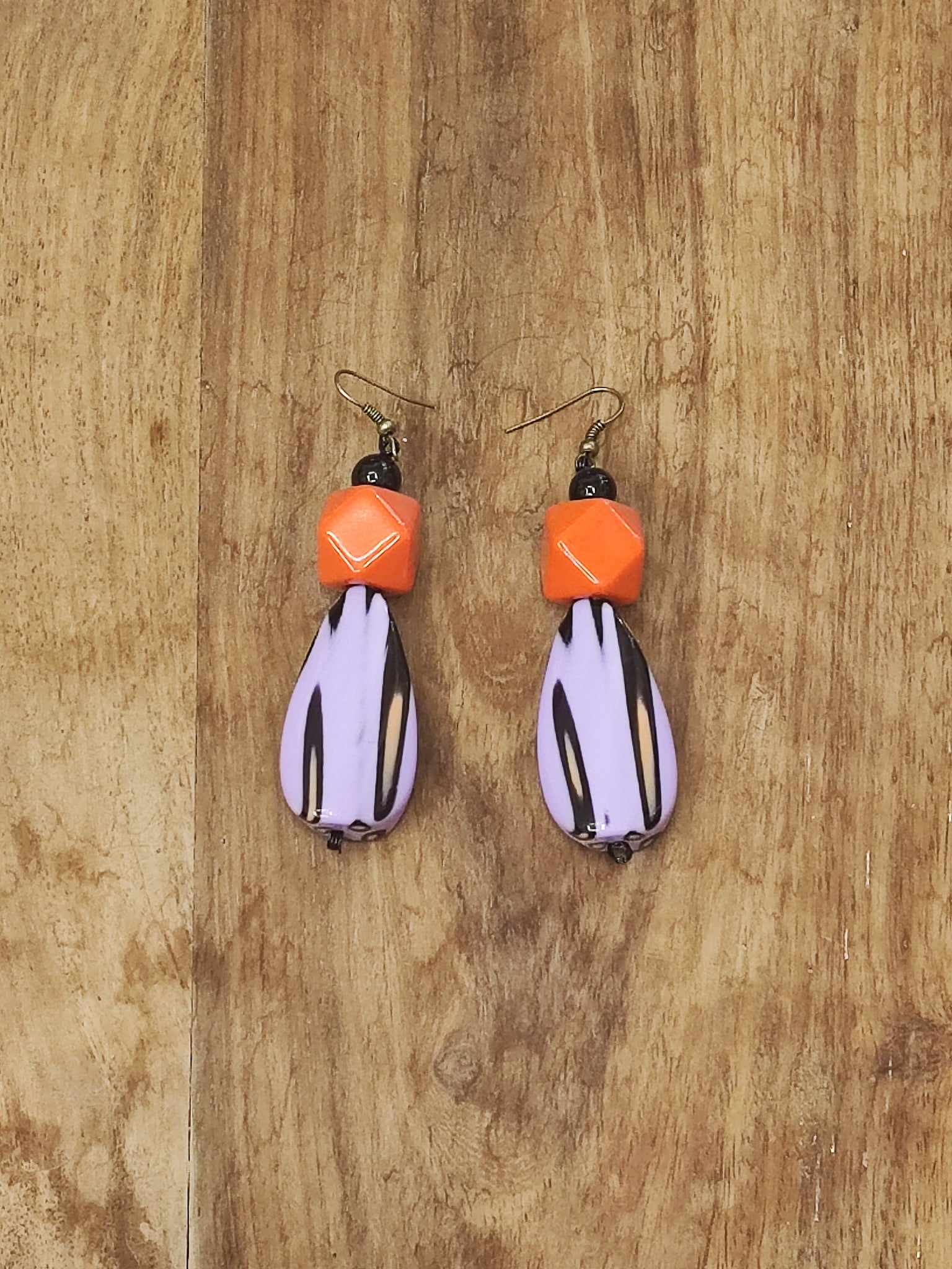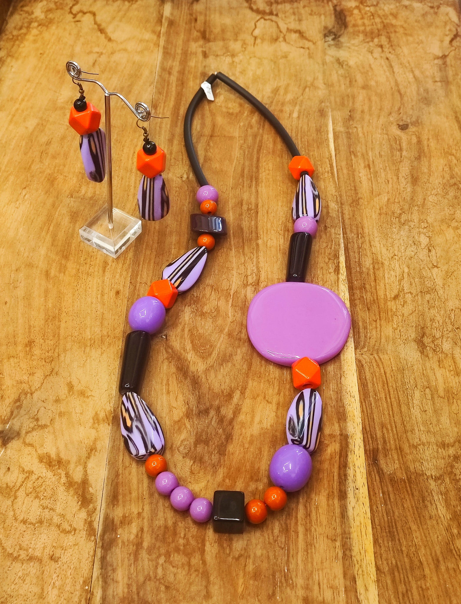 Gli orecchini pendenti completano l’insieme, riprendendo la forma a goccia lilla con venature viola e una perla arancione, per un effetto raffinato e coordinato.