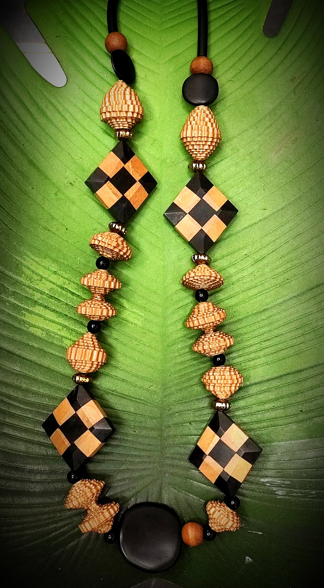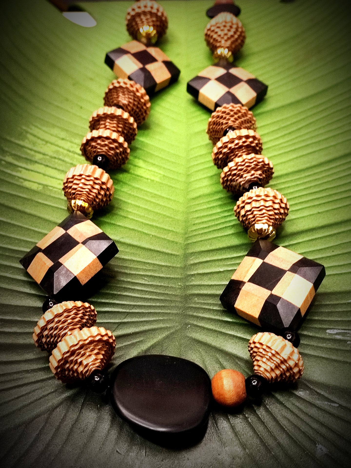 Collana lunga caratterizzata da calde sfumature marroni, questa creazione evoca il gioco degli scacchi grazie agli inserti in legno finemente lavorato e alle perle realizzate in carta e vetroresina.