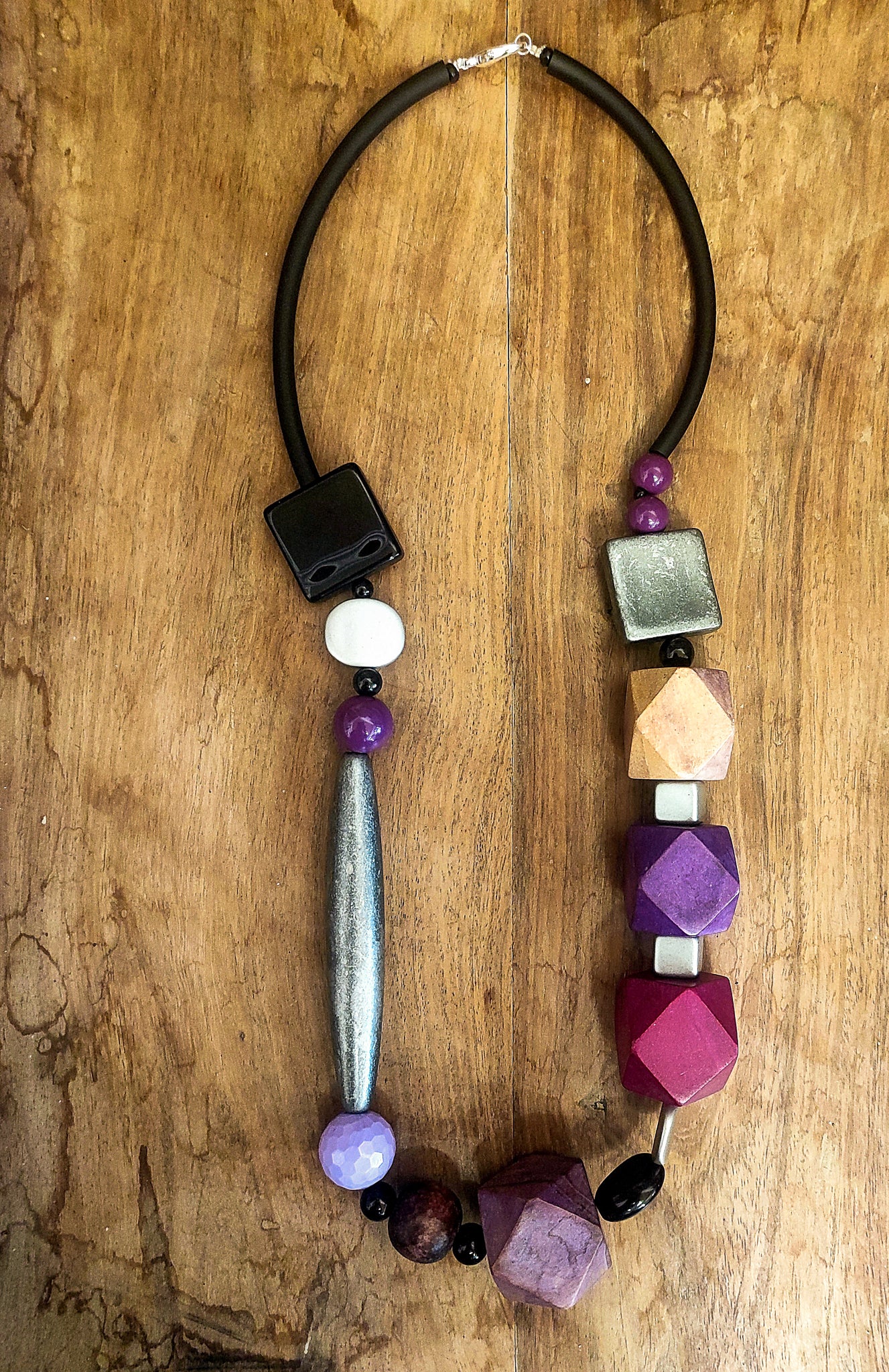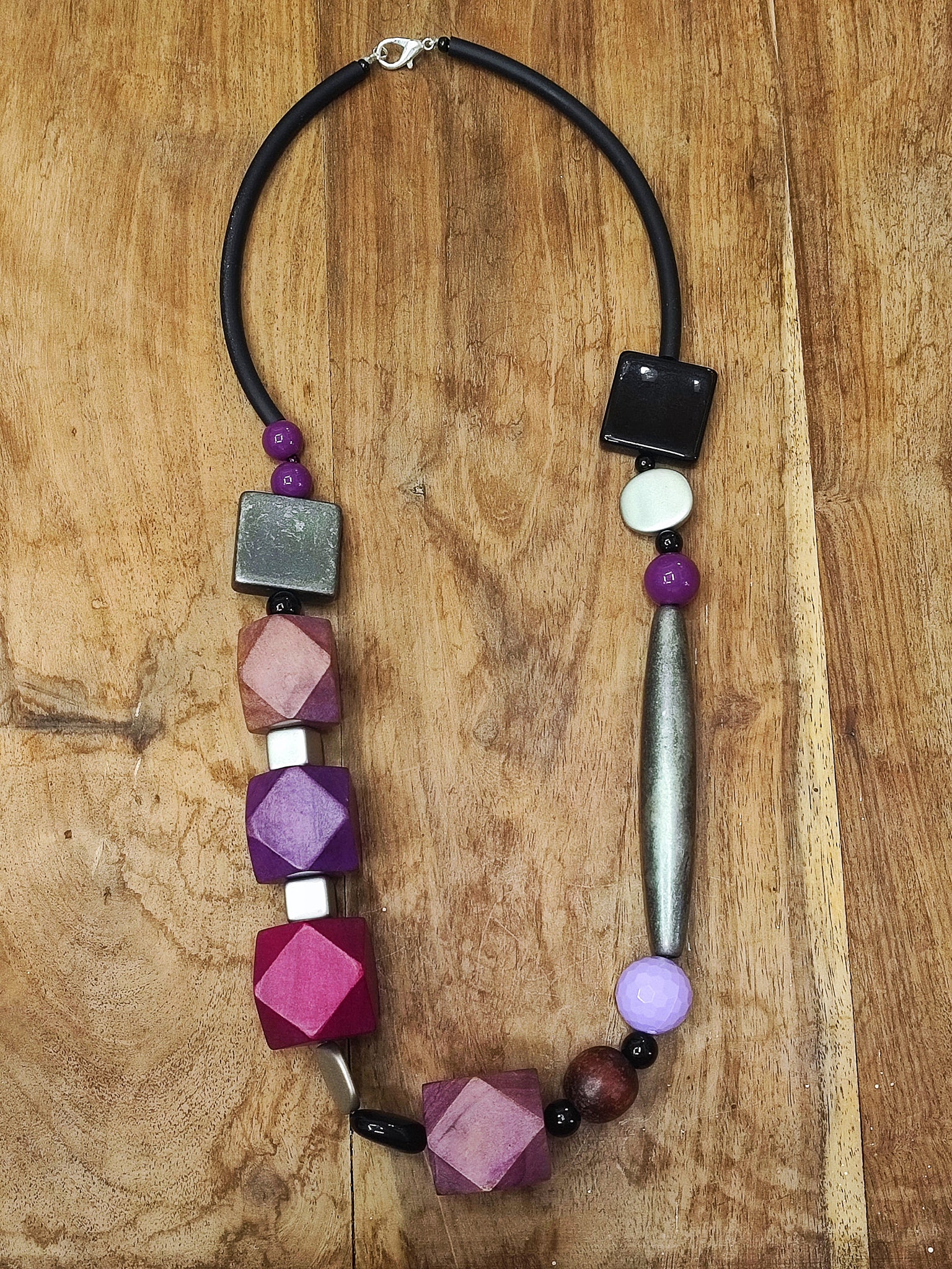 La collana Sculpture presenta un raffinato gioco di forme quadrate e cilindriche in legno, caratterizzate da delicati toni argento e viola, intervallate da piccoli dettagli in resina con finitura spazzolata.