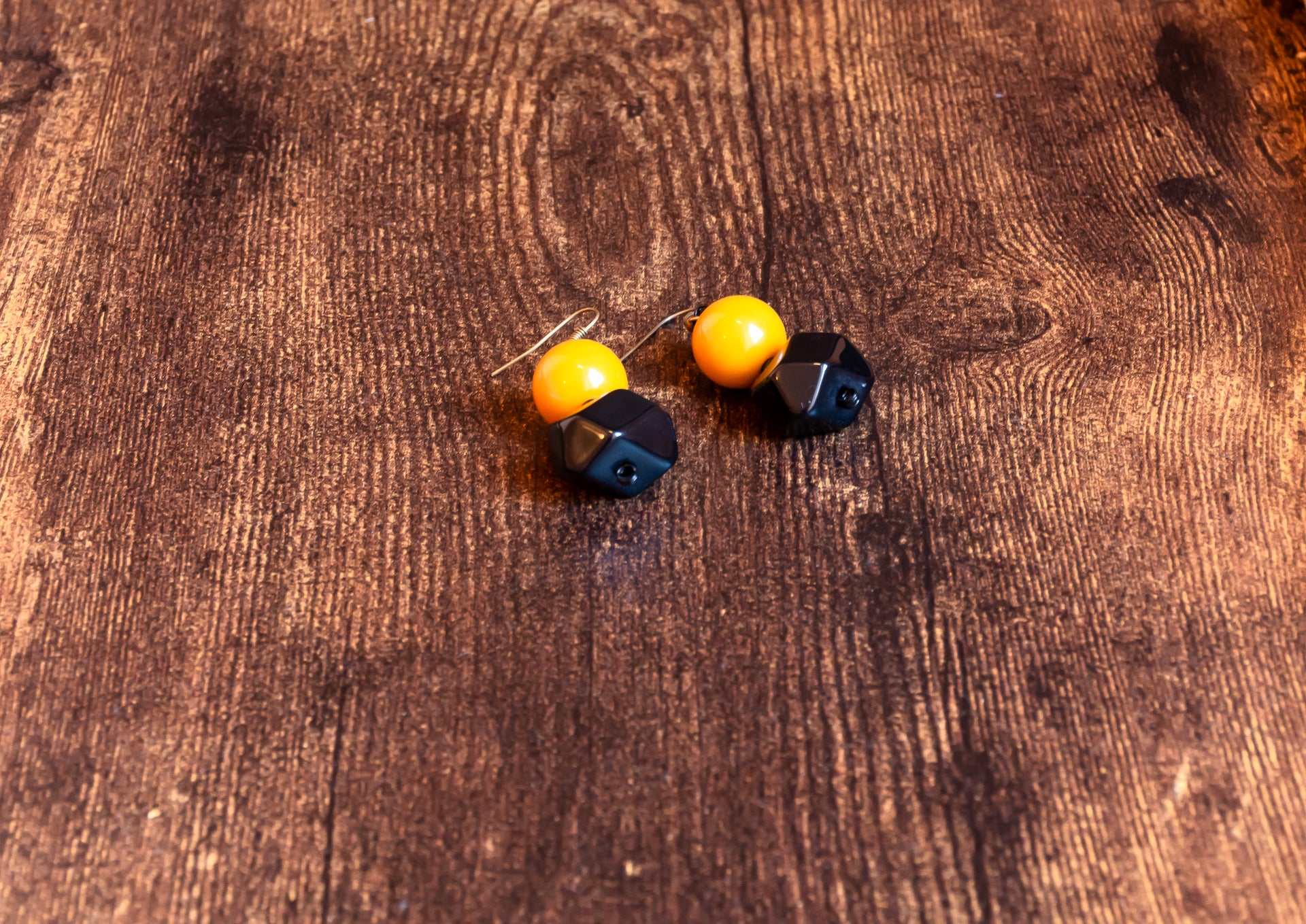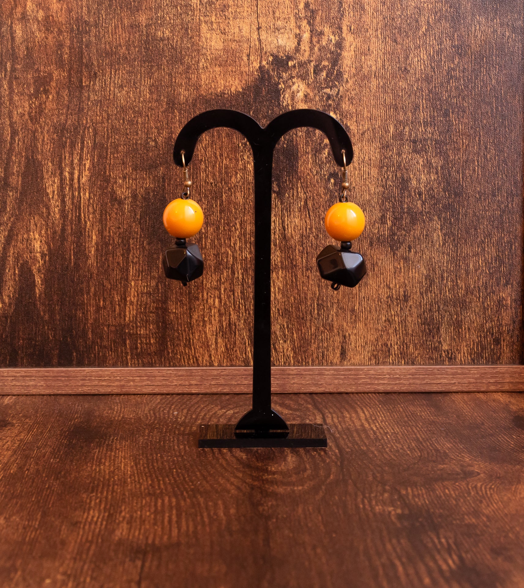 Elegante girocollo dai colori oro, nero, arancio e verde oliva in vetroresina e resina smaltata, accompagnato da una coppia di orecchini pendenti nero e arancio.
