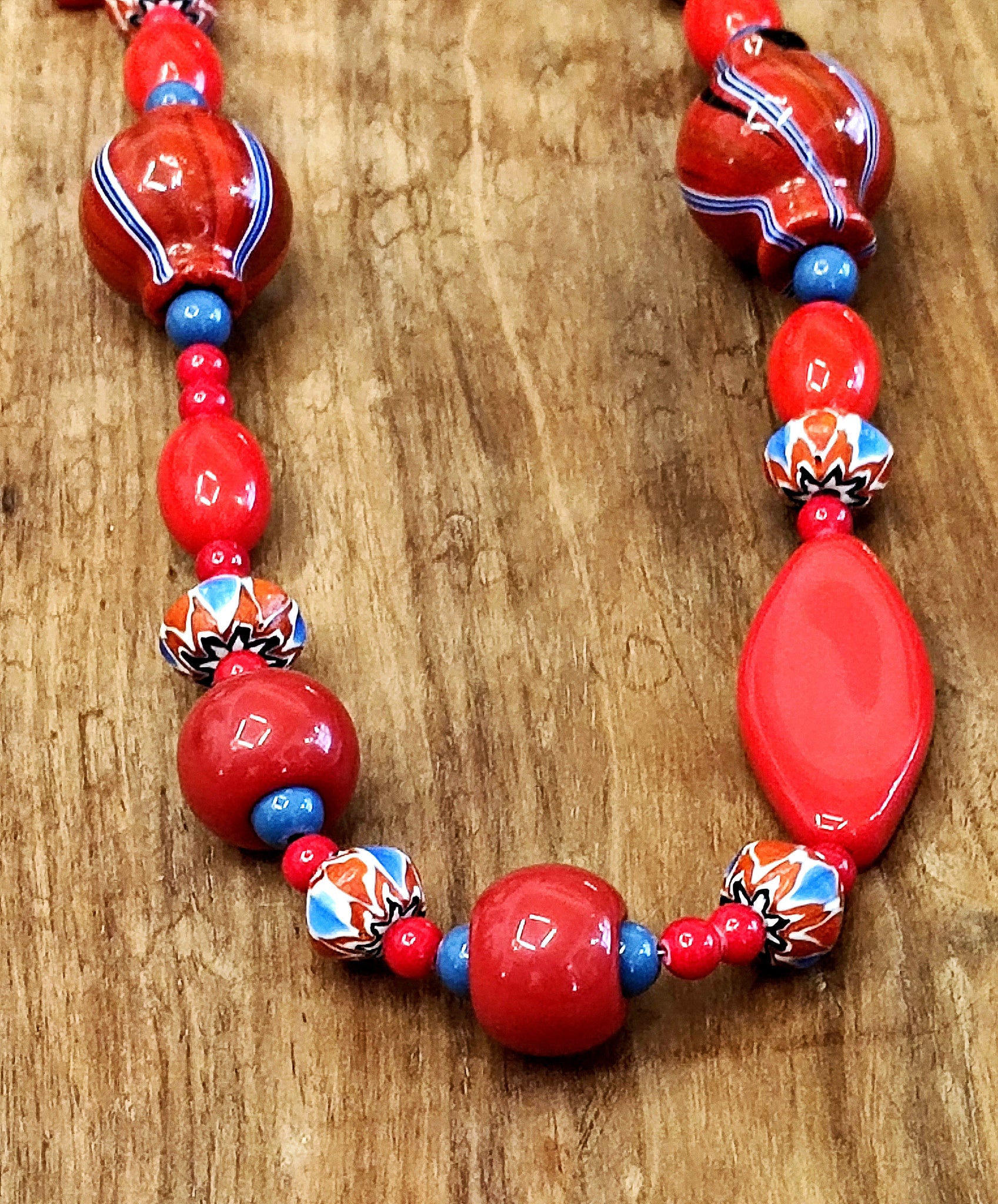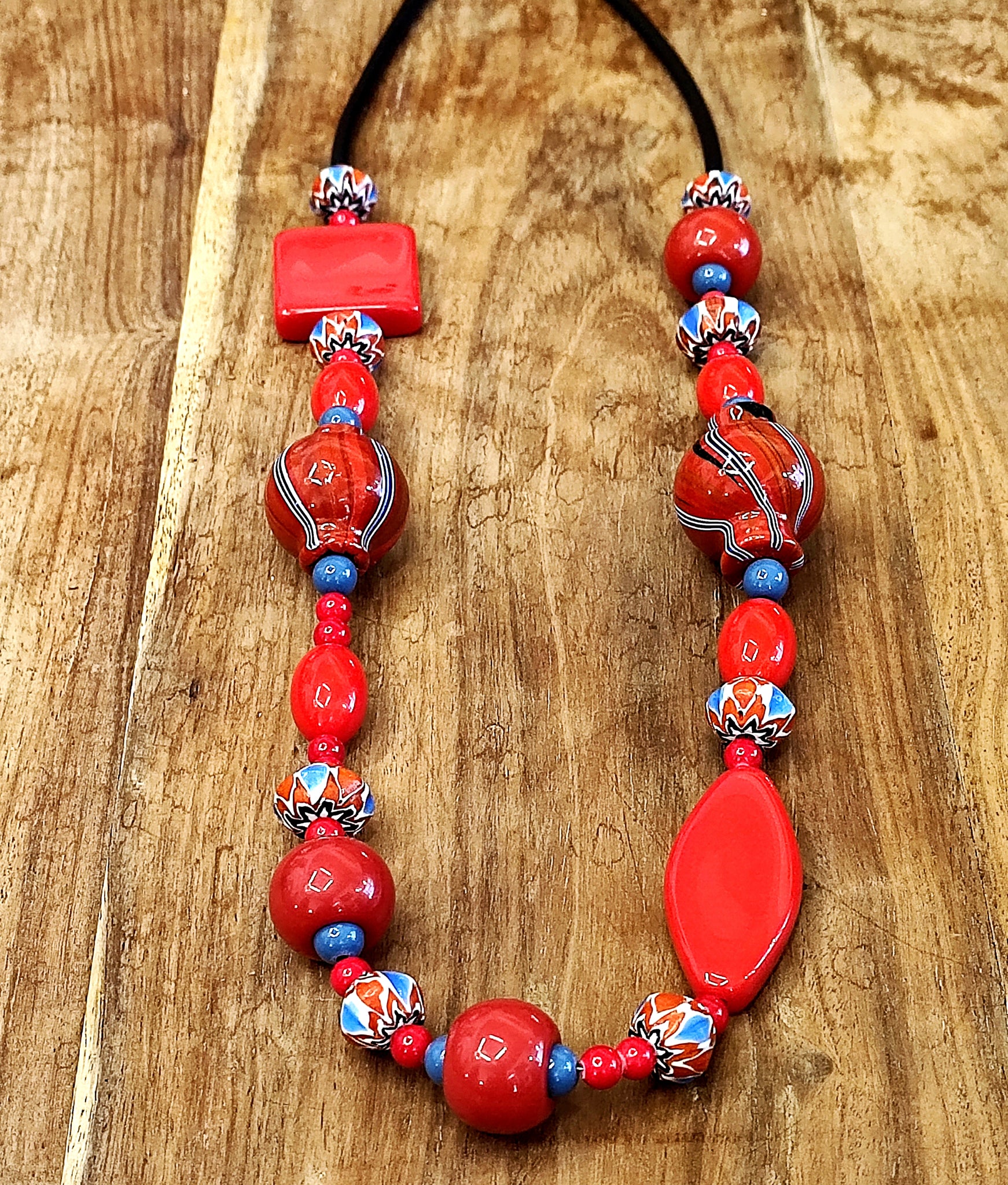 Collana lunga rossa che unisce l'eleganza del vetro di Murano con perle di ceramica e vetro resina. Il design alterna sapientemente forme tondeggianti, ovali e quadrate, creando un gioco di volumi che esalta la tradizione artigianale veneziana. Ogni elemento è accuratamente selezionato per garantire armonia cromatica e unicità stilistica.