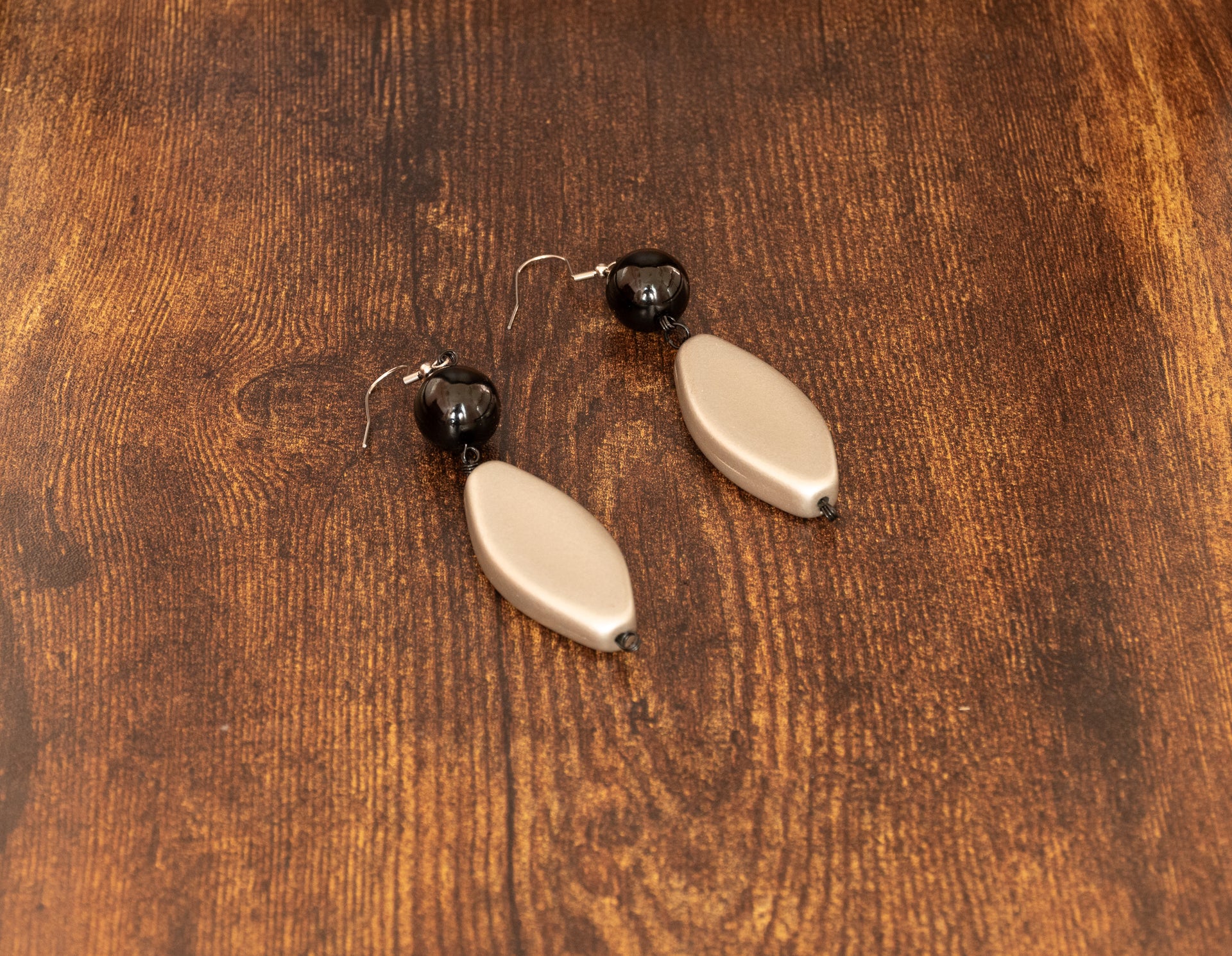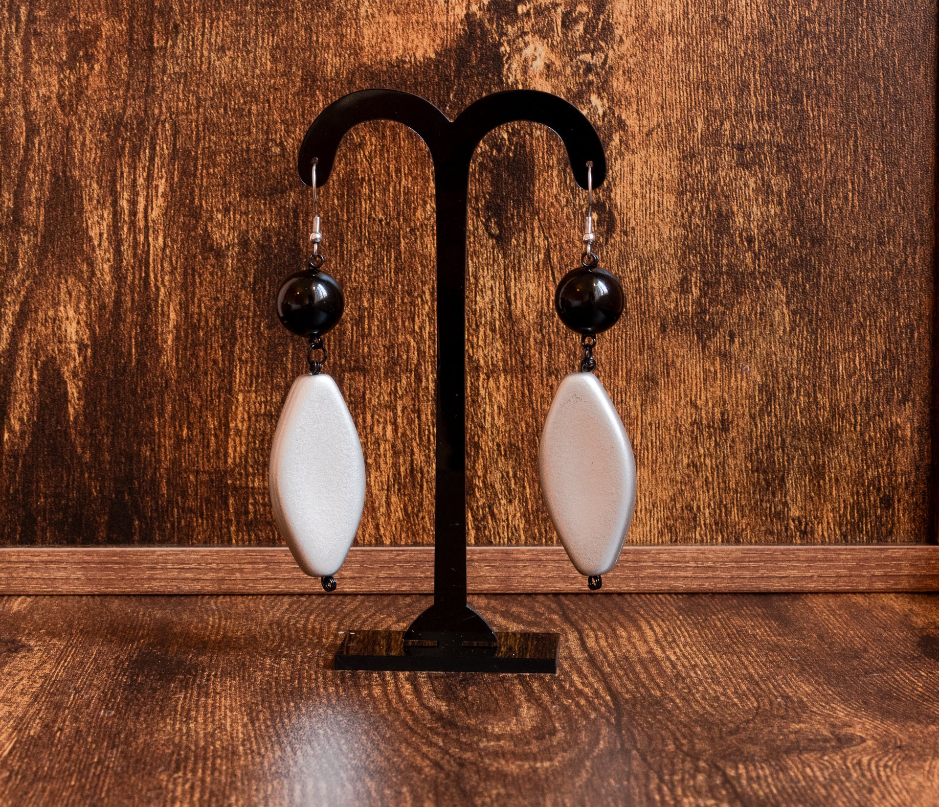 Orecchini raffinati caratterizzati da una goccia in vetroresina argentata satinata, abbinata a una piccola perla nera tonda sempre in vetroresina.