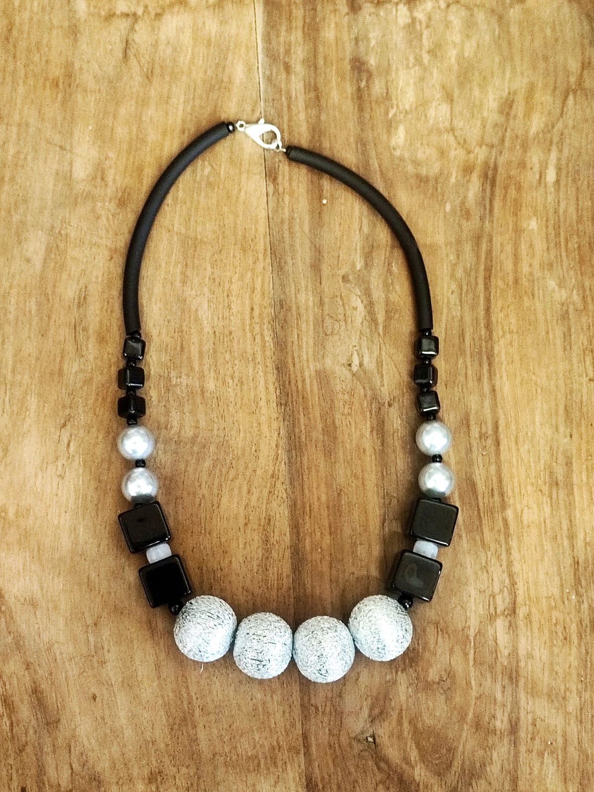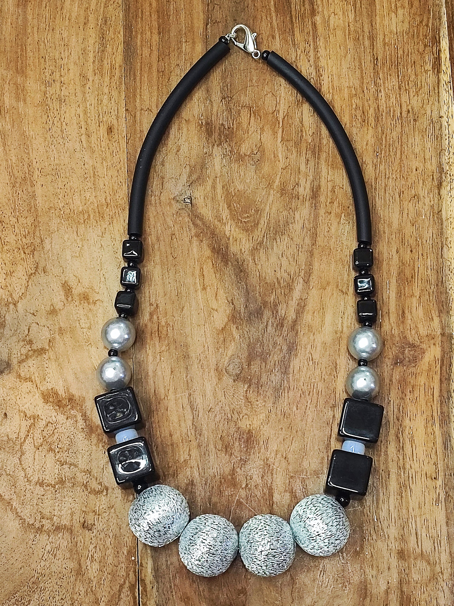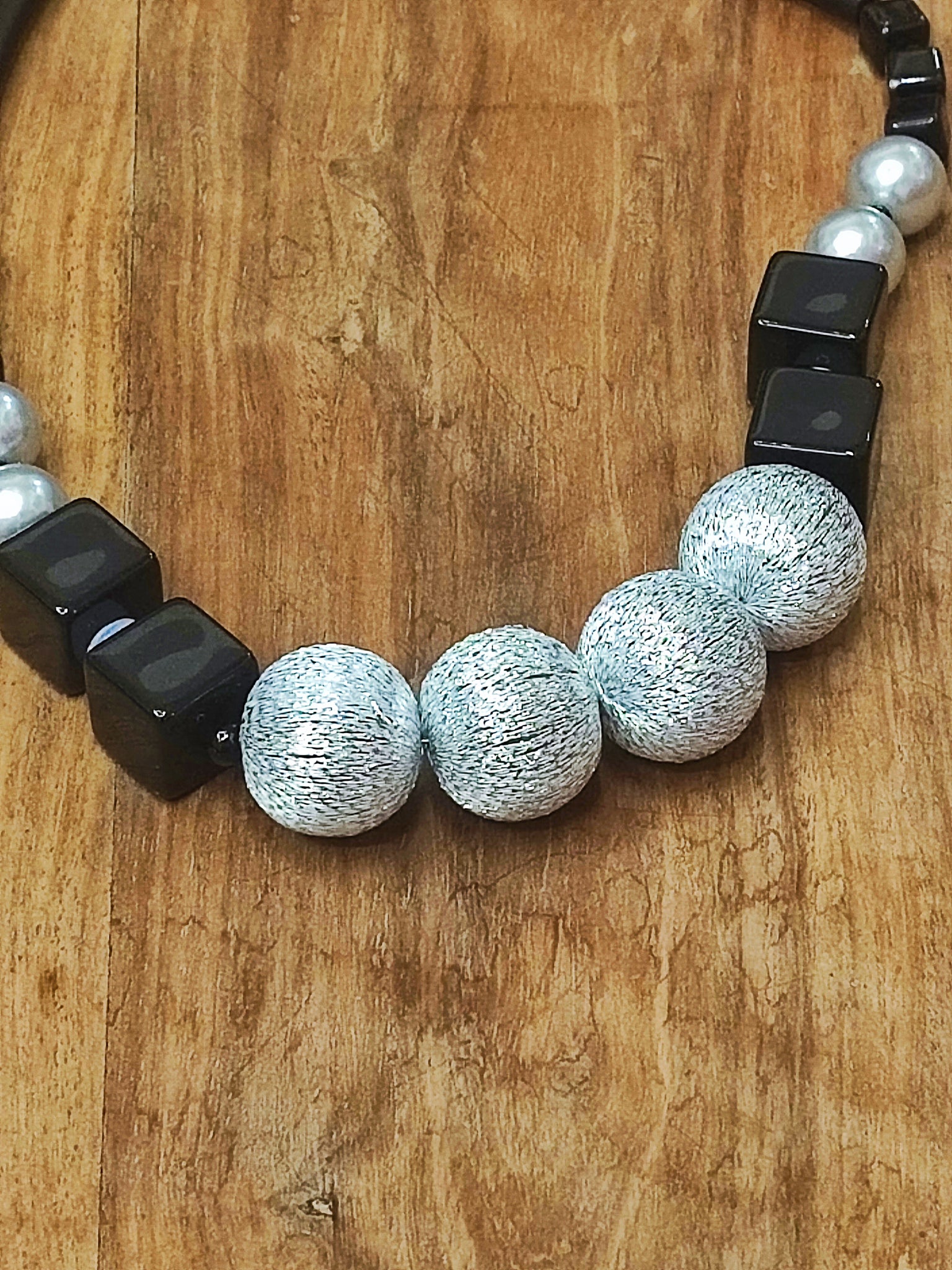 Raffinata collana girocollo in nero e argento. Un esemplare unico di straordinaria eleganza che combina perle nere in vetroresina con preziose perle argentate in seta per un contrasto di texture sofisticato.