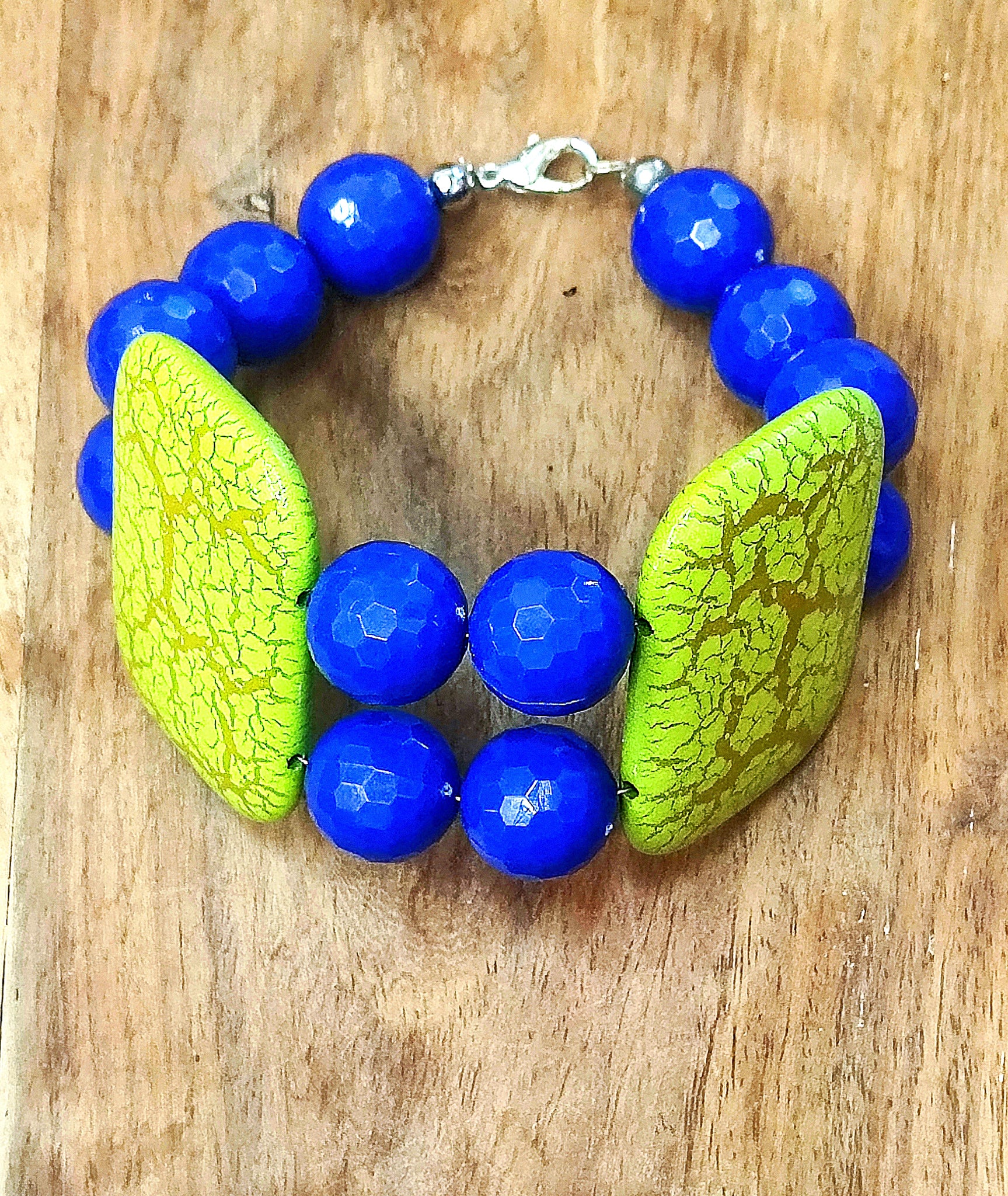 Il bracciale coordinato riprende i motivi geometrici e i contrasti di blu elettrico e giallo, completando l’insieme con un tocco distintivo e sofisticato.