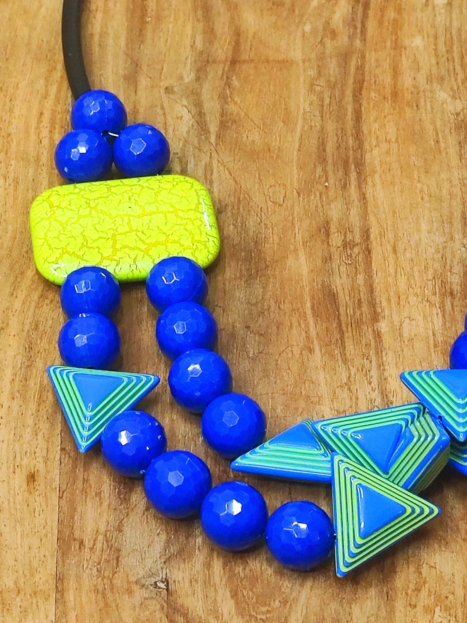 Collana Matinèe raffinata che richiama l’atmosfera estiva con perle sfaccettate in vetroresina blu elettrico e dettagli geometrici blu con venature gialle. Due grandi inserti rettangolari in vetroresina gialla bilanciano armoniosamente il design, dando vita a un accessorio elegante che esprime la vivacità cromatica della stagione.