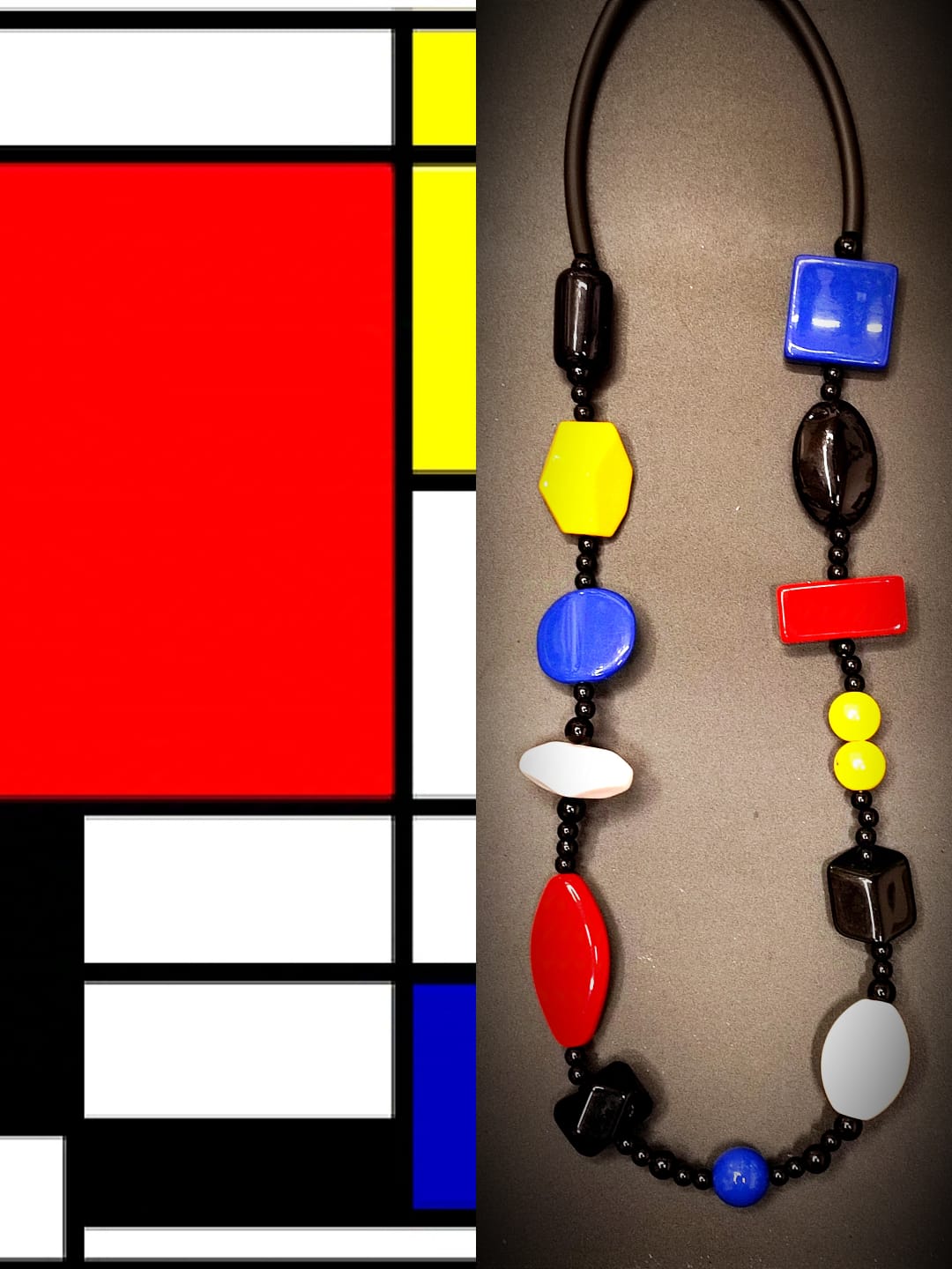 Elegante collana Matinée dal design contemporaneo caratterizzata da forme geometriche con tonalità vivaci armoniosamente equilibrate su base nera. L'estetica raffinata richiama le composizioni e la palette cromatica distintiva dell'artista Mandrian, offrendo un accessorio di elevata ricercatezza stilistica.