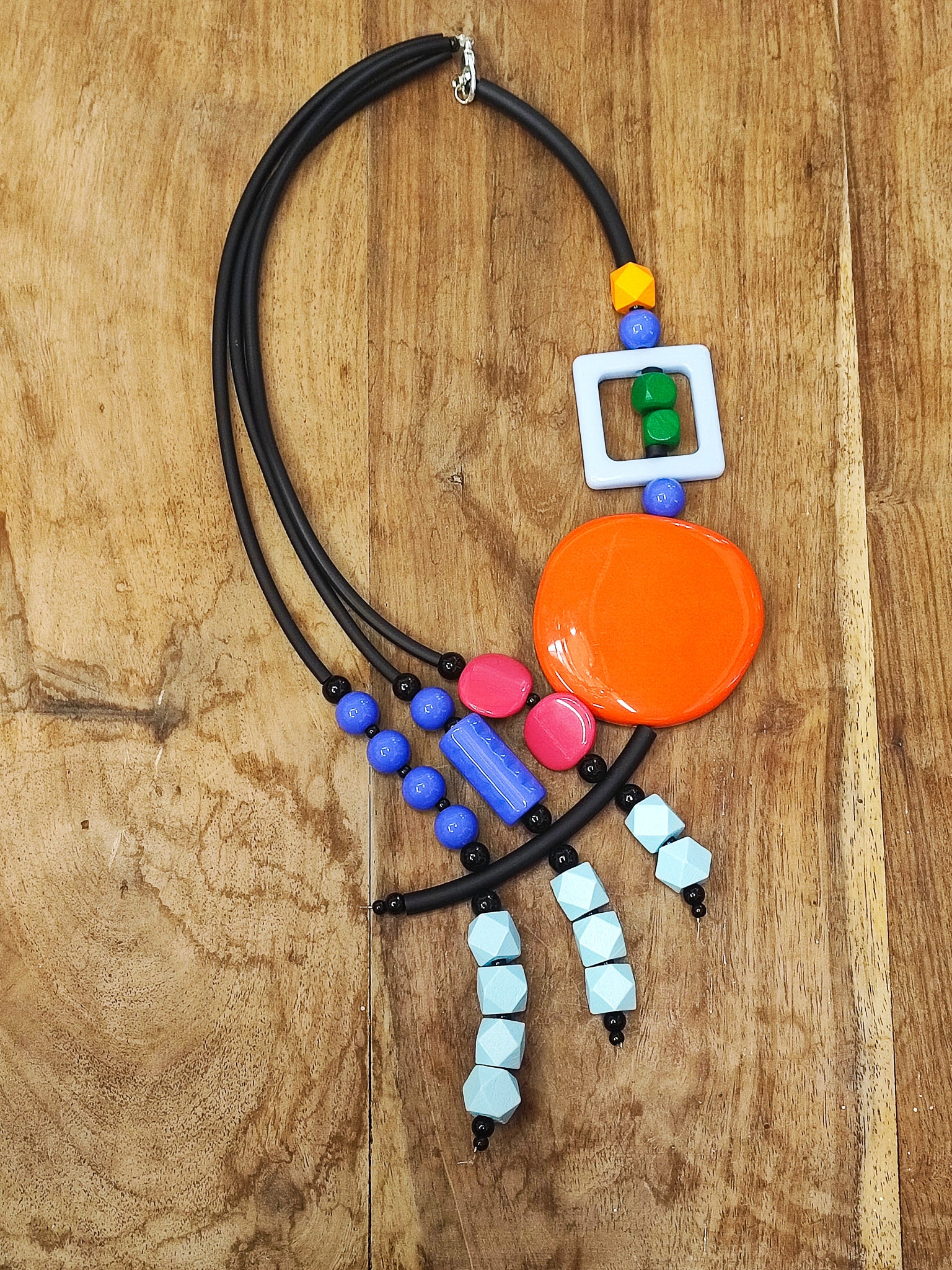 Collana girocollo caratterizzata da un intreccio in caucciù, arricchita da perle in vetroresina e legno che creano un vivace mix di colori, esaltando un senso di gioia e vitalità.