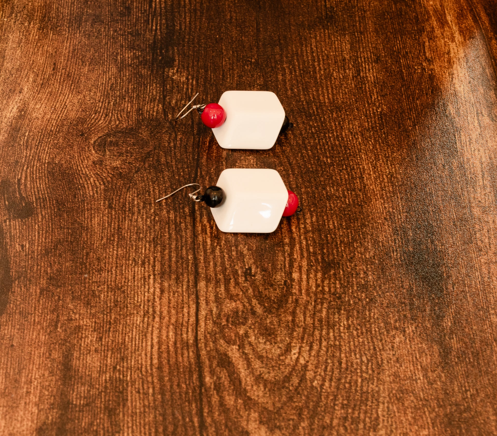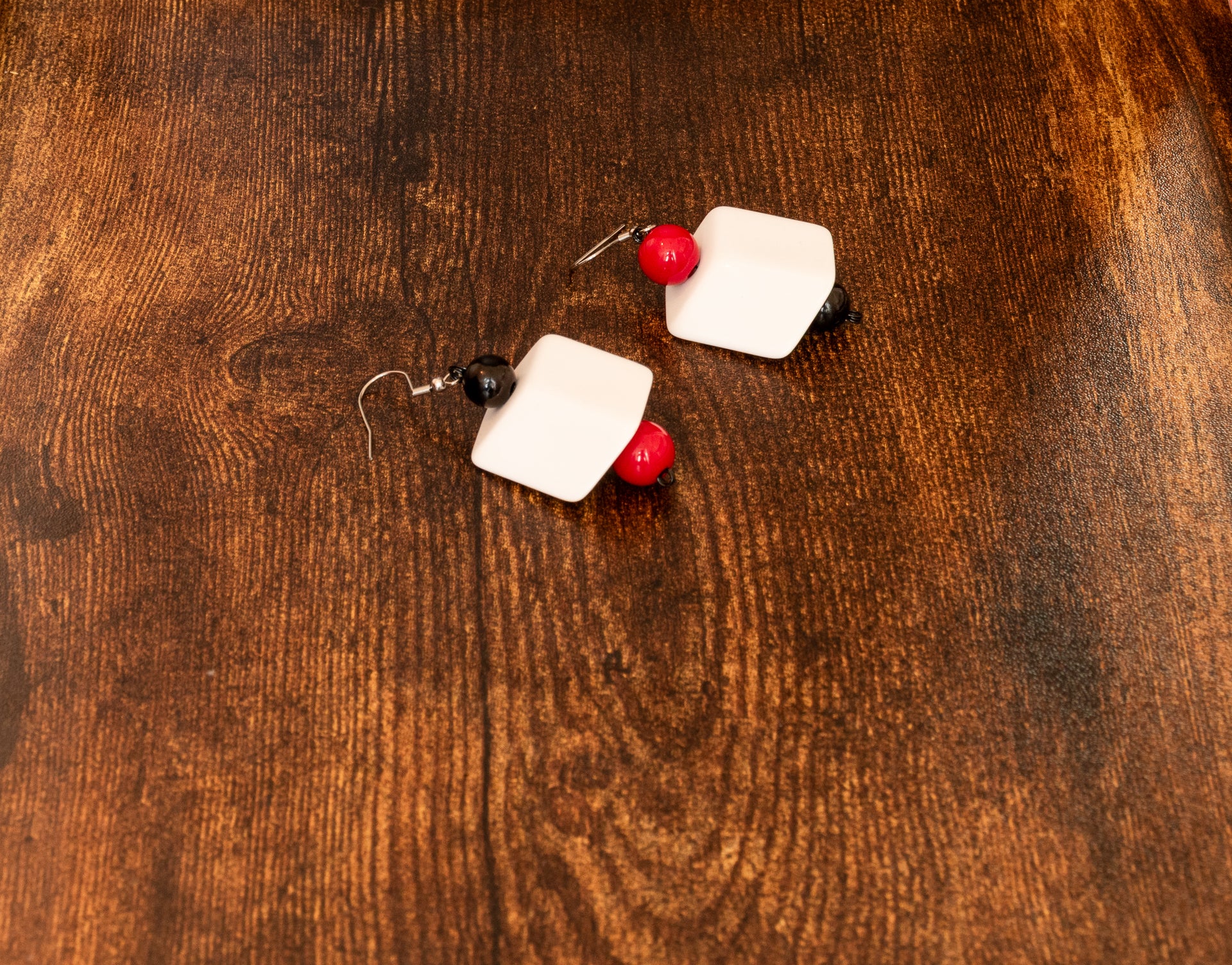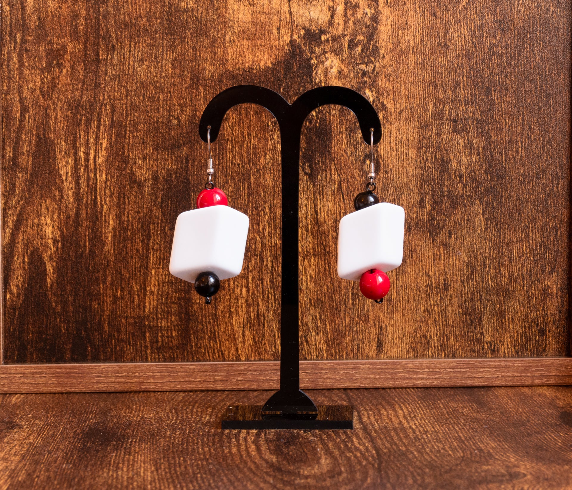 Questi orecchini offrono un intrigante gioco di forme geometriche, con un cubo in vetroresina bianca abbinato a perle nere e rosse disposte in modo opposto su ciascun orecchino, rendendoli un accessorio originale e distintivo.
